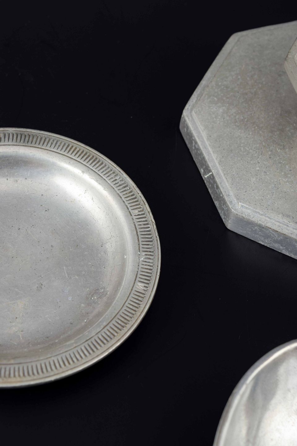 Samling af tre små skåle og en lysestage i tin.