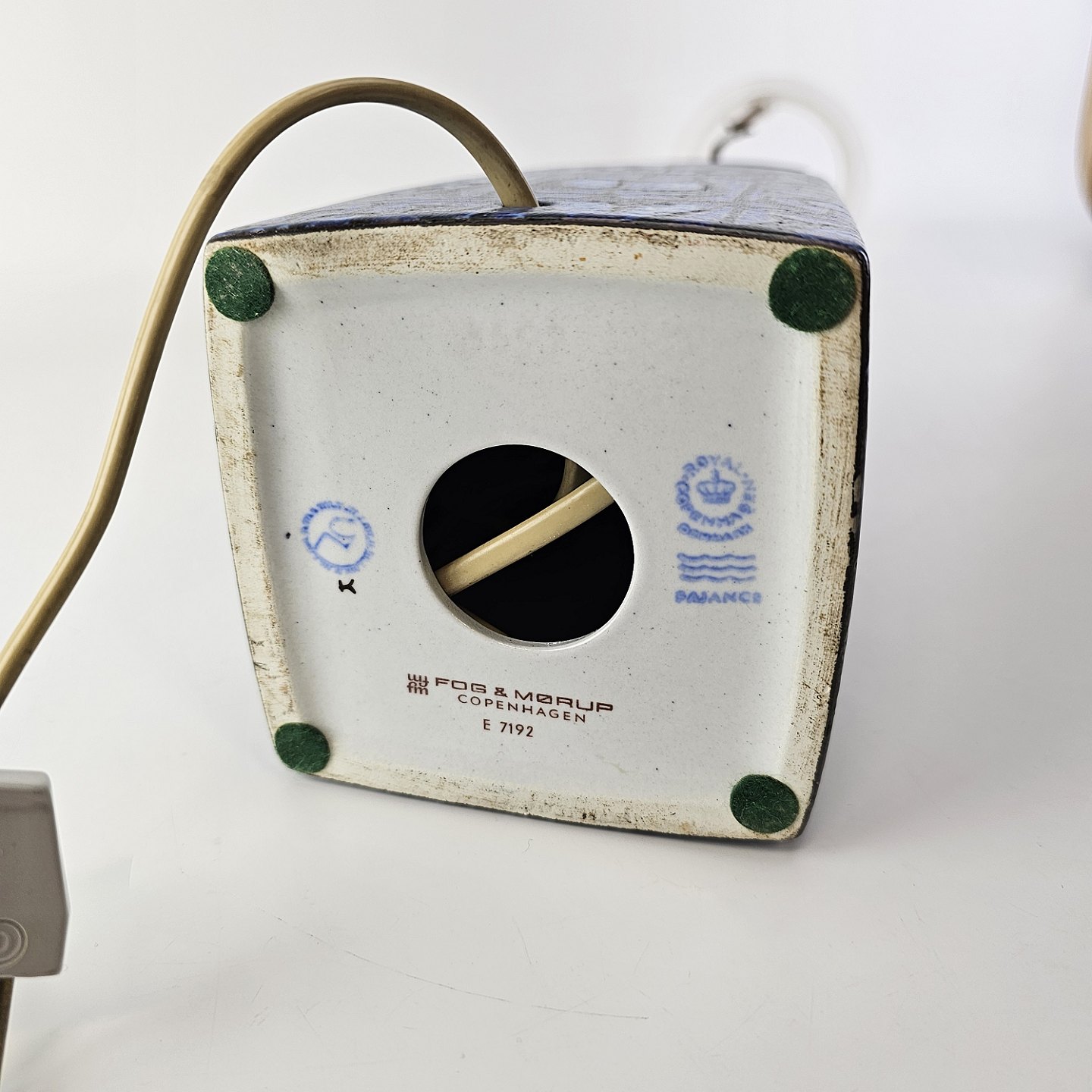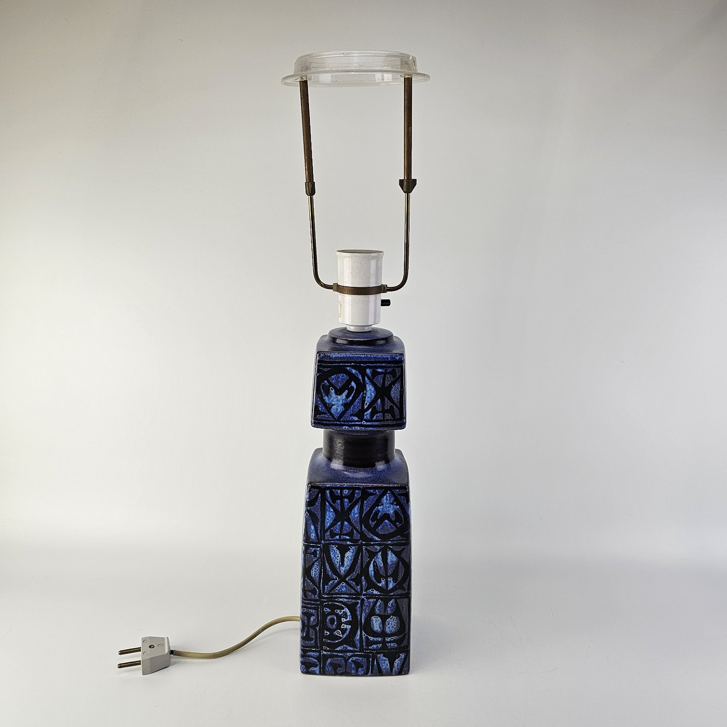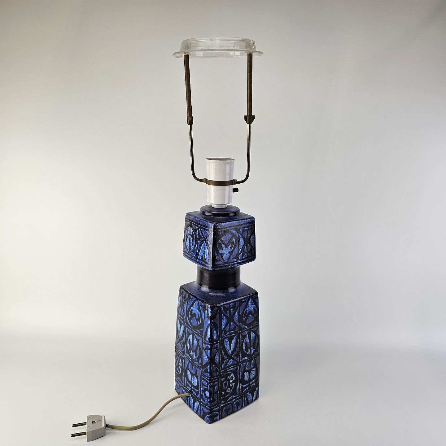 Bordlampe i fajance med abstrakt mønster af firkanter i blå nuancer