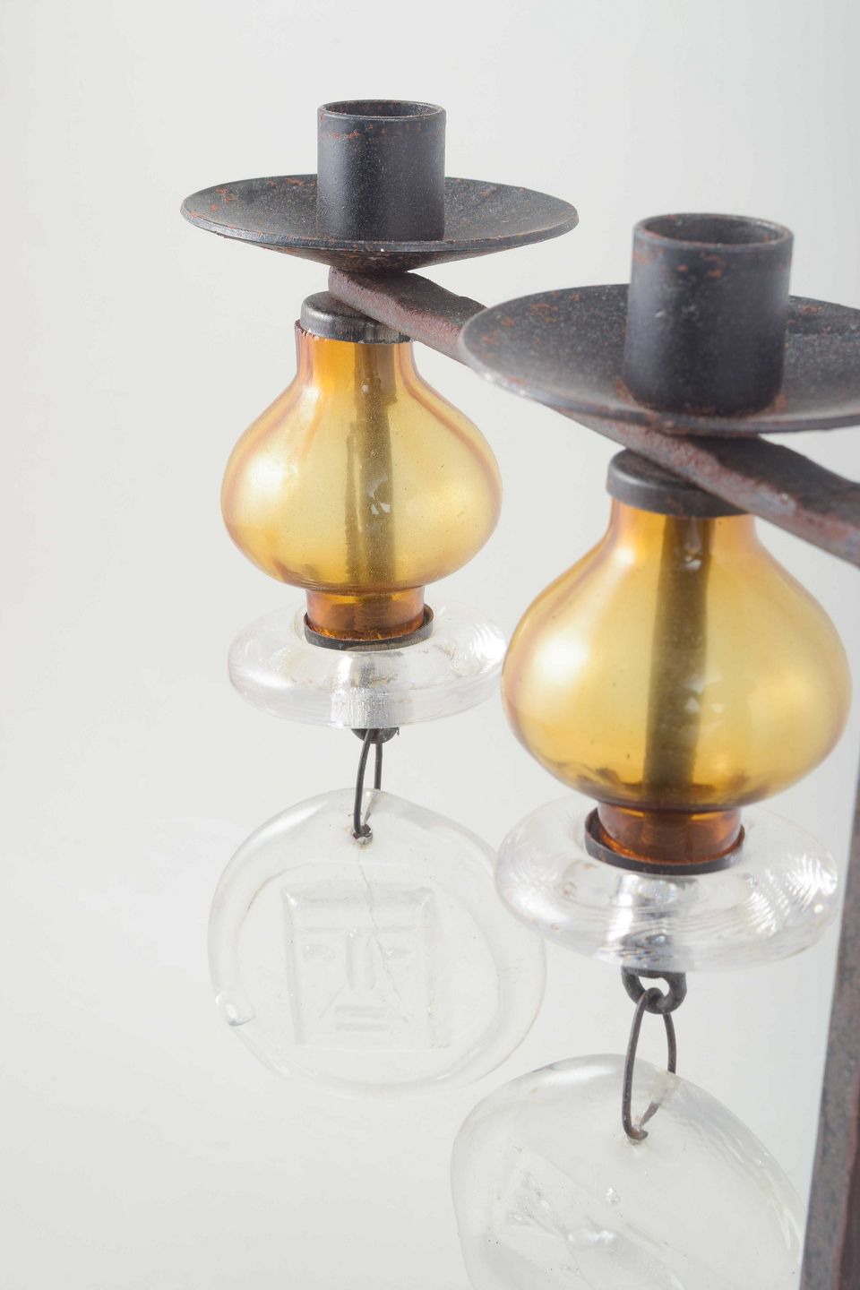 En dekorativ firearmet stage af Erik Höglund for Kosta Boda, udført i jern med håndblæste glasprismer i rav og klart glas. Prismerne bærer det karakteristiske indpressede ansigtsmotiv, der blev et signaturtræk i Höglunds design.