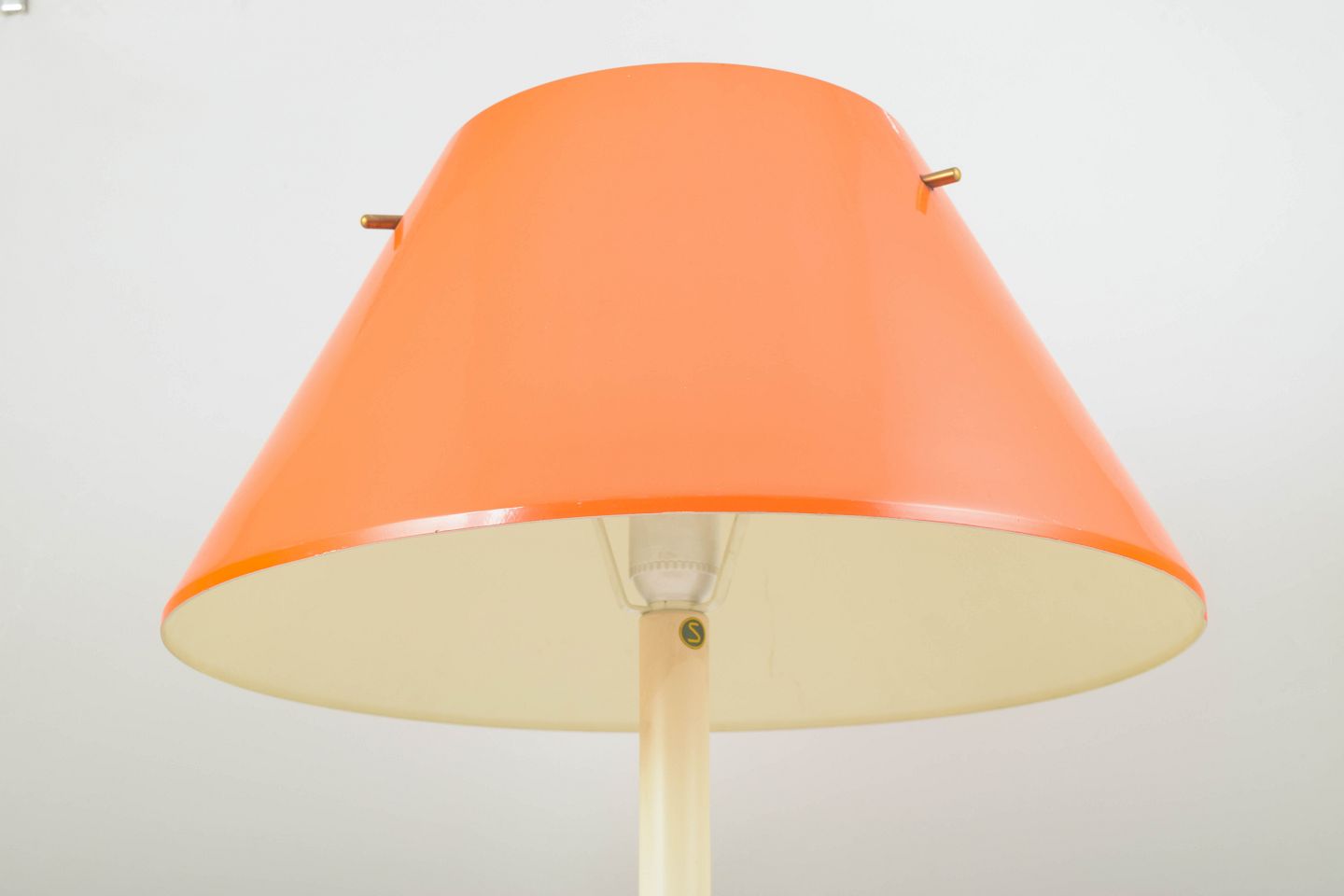 Bordlampe med konisk skærm i laksefarvet lakeret metal og stander i cremefarvet lakeret metal.