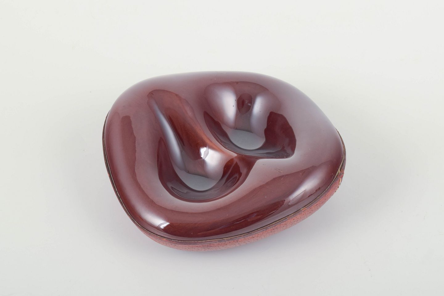 Organisk formet skål i keramik med dyb bordeaux glasur. Monteret med læderbetrukket underside, stemplet med Longchamp-mærke.