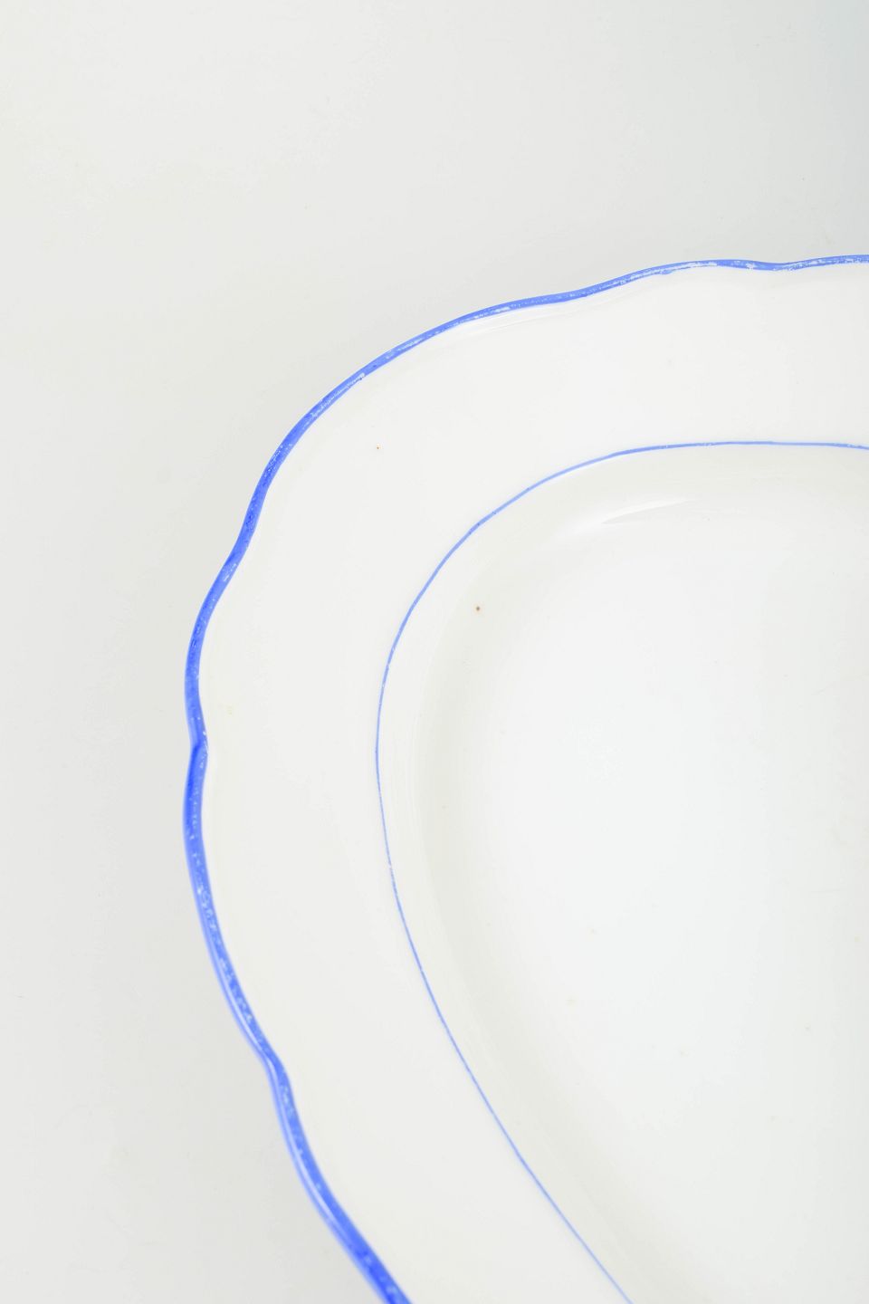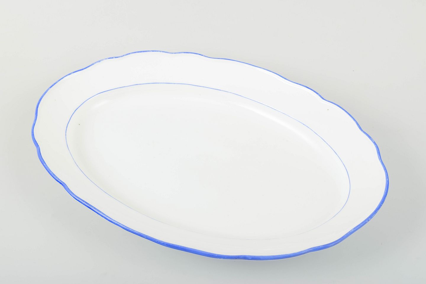 Serveringsfad i hvidglaseret porcelæn med bølget kant og blå staffering.