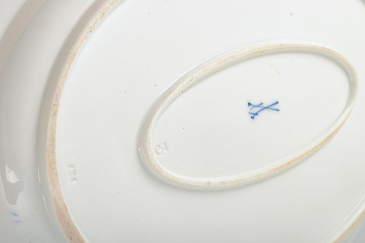 Stempel: Krydsede sværd i underglasurblå, indpressede tal og mærker