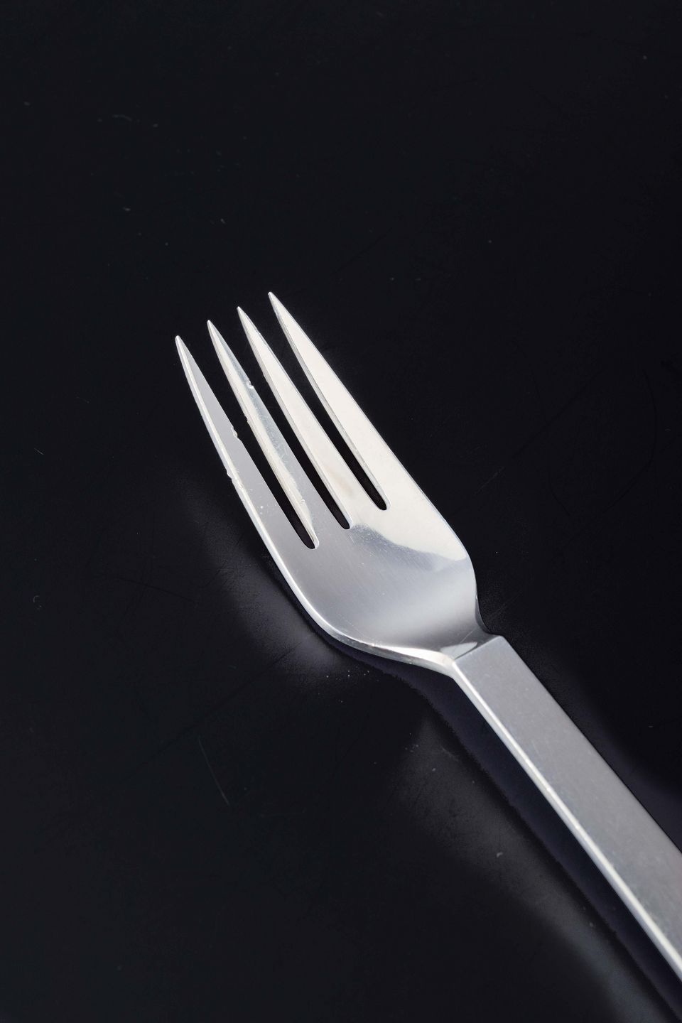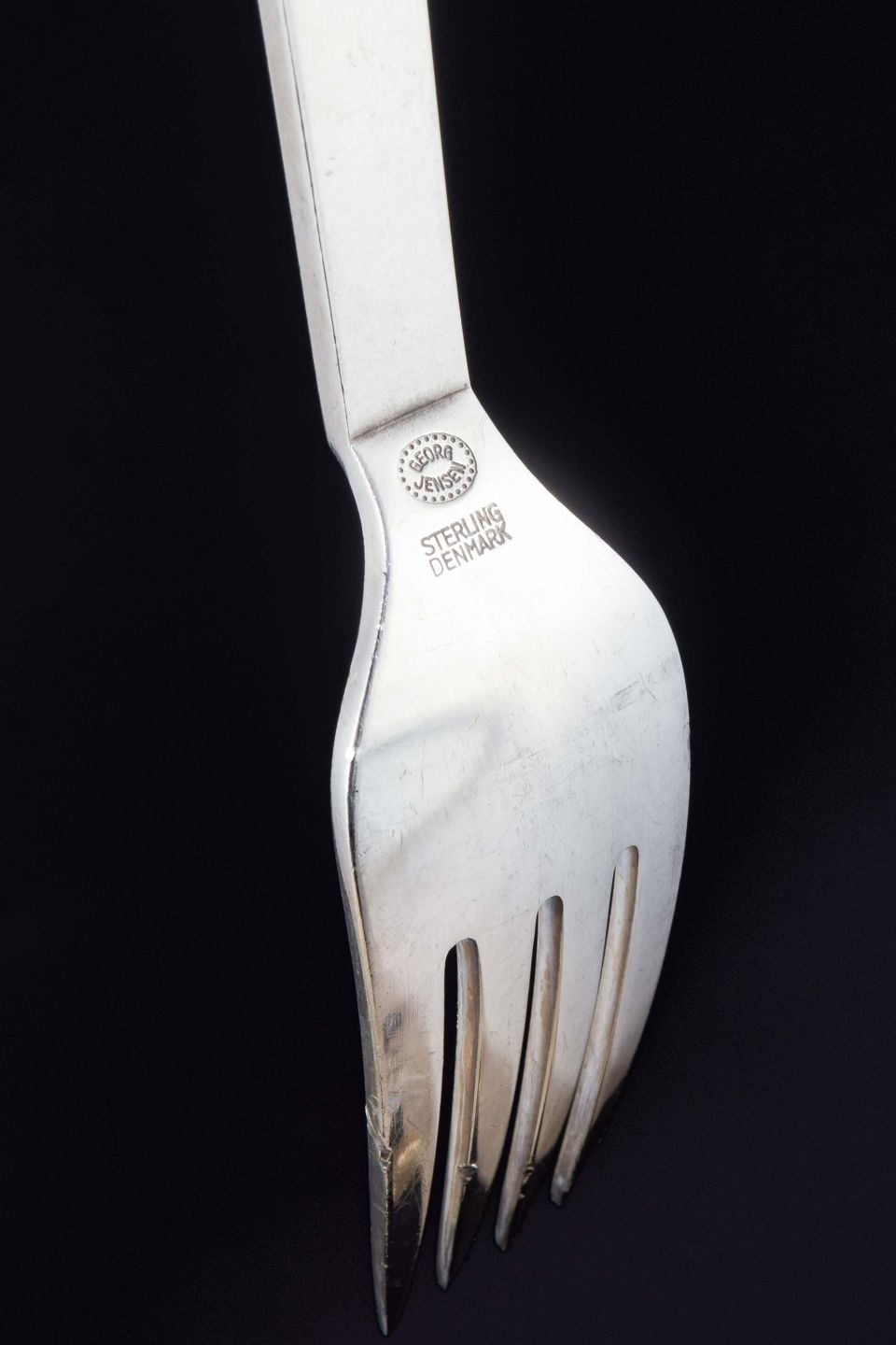 En klassisk lille frokostgaffel fra Georg Jensen i det tidløse “Pyramide”-mønster, designet af Harald Nielsen i 1926 og fremstillet efter 1945. Mønstret er kendetegnet ved sit stramme og funktionalistiske formsprog med diskret geometrisk detalje.