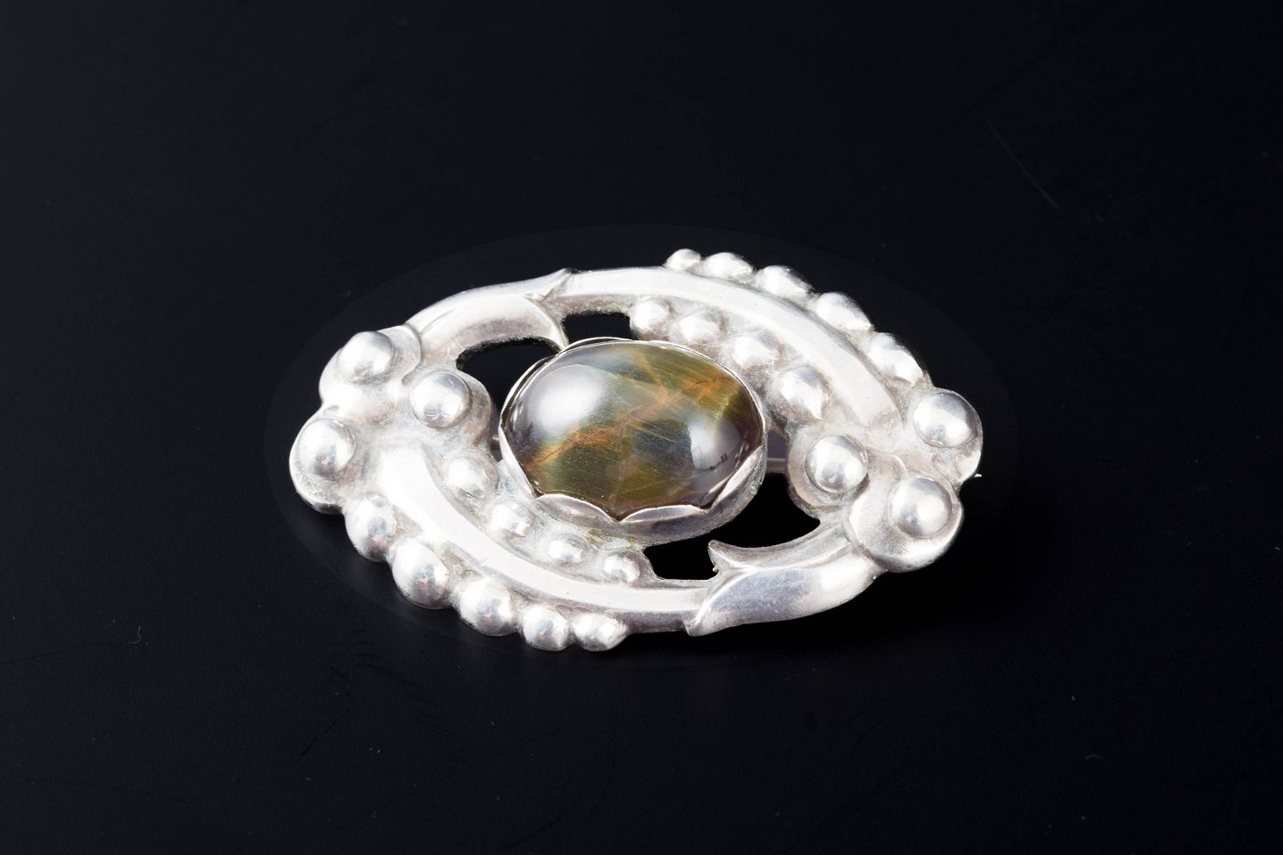Oval broche i sølv med cabochon sleben katteøje (chrysoberyll).