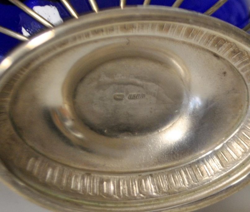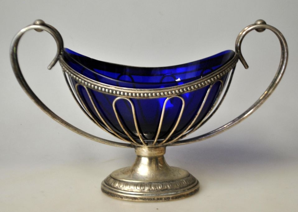 WMF sukkerkumme, ca. 1900. Tyskland. Forsølvet sølv med cobolt blå glas indsats. Empire stil. H.: 15 cm. L.: 23 cm. Stemplet.