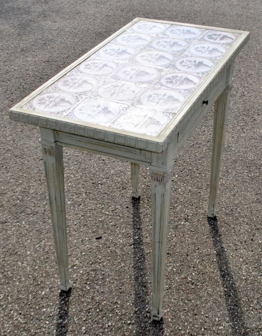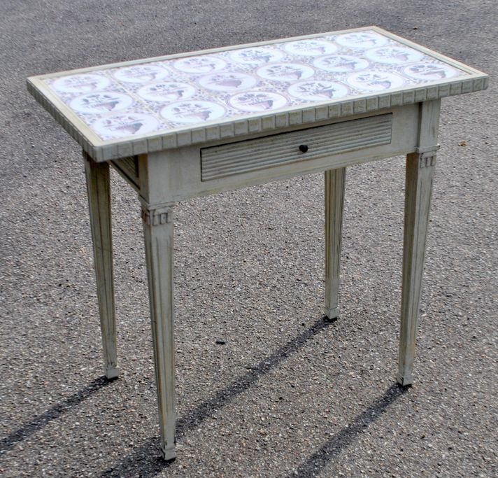 Louis XVI hvidmalet flisebord, 20. årh. Med tilspidsede ben med kannelleringer. Kant med tandsnit. Skuffe, der kan åbnes til begge sider. Med 18 antikke manganfarvede fliser med "blumen pot" motiv. L.: 83 cm. B.: 43,5 cm. H.: 73 cm.