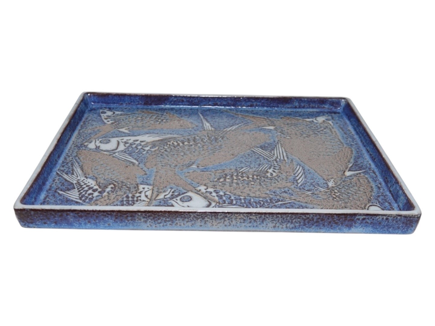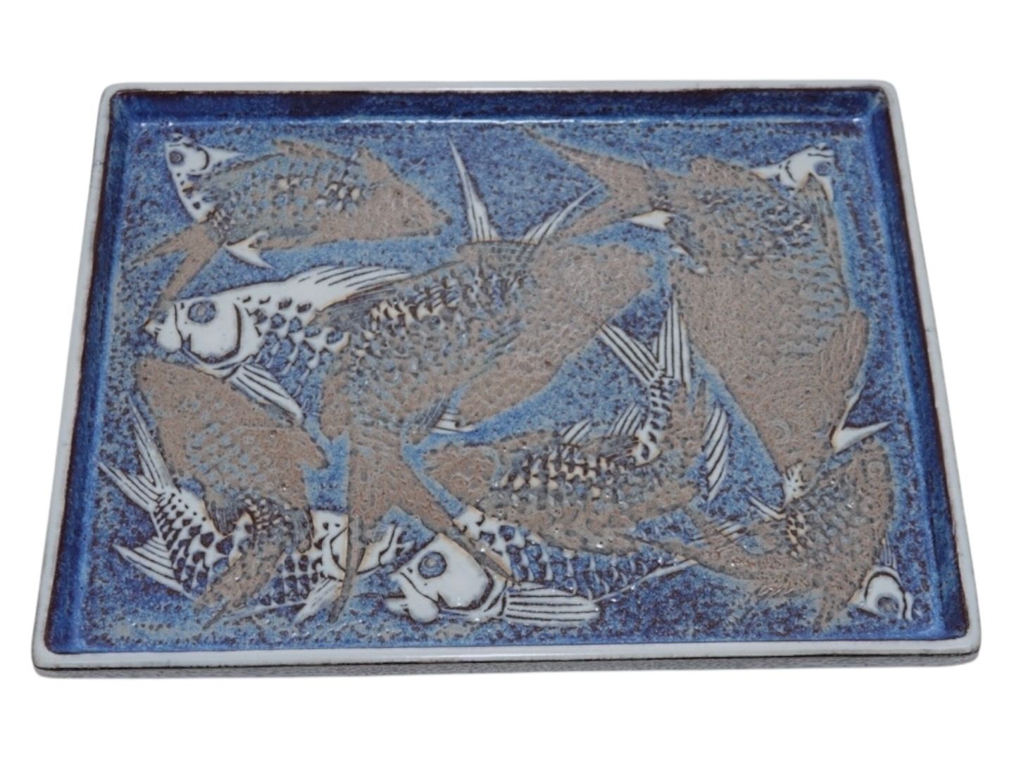 Royal Copenhagen Baca, firkantet blå bakke med fisk.