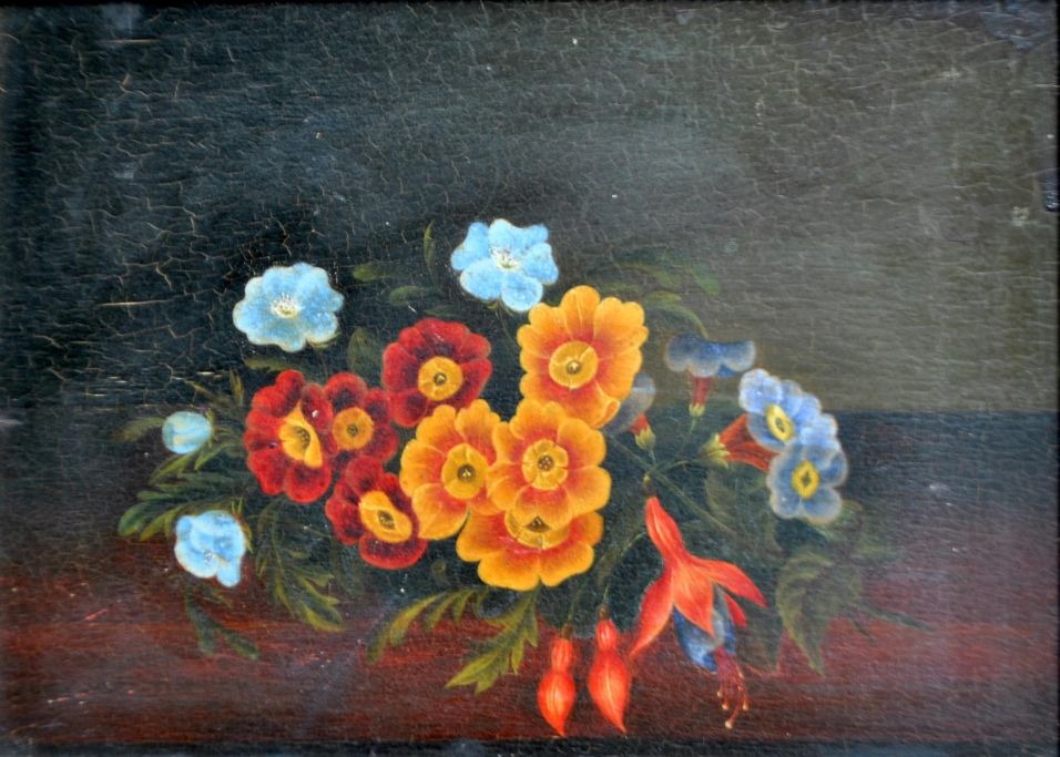 Dansk kunstner (19. årh.) Opstilling med blomsterbuket på et bord. Olie på mahogni plade. Usigneret. 18 x 24,5 cm.