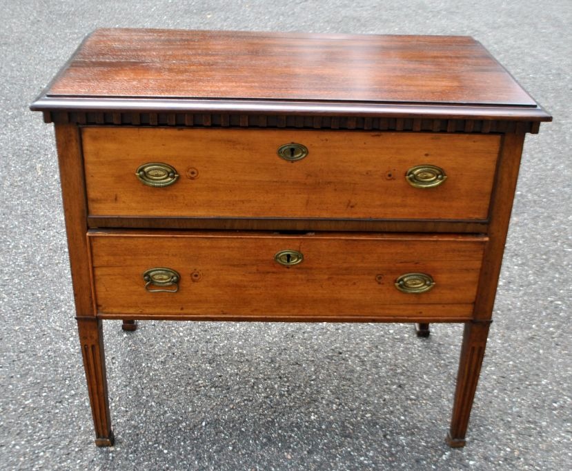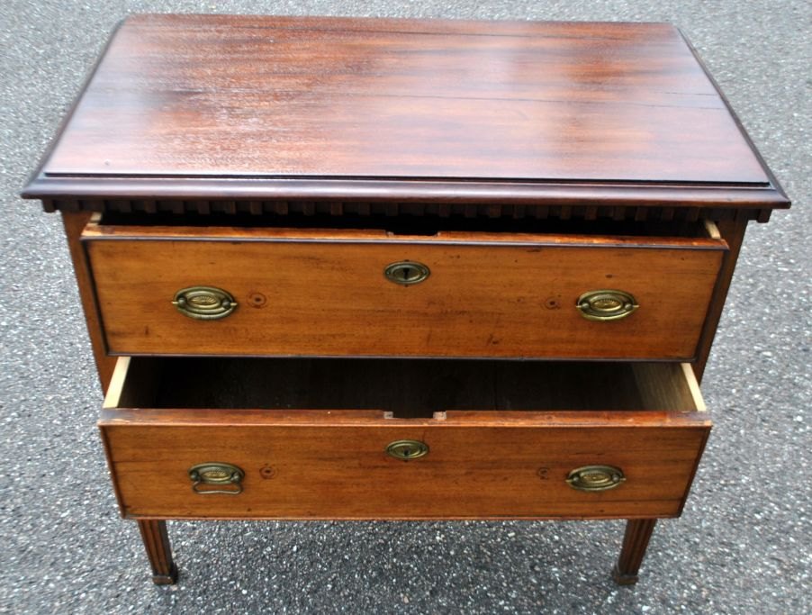 Engelsk Louis XVI mahogni kommode, ca. 1780. Med tilspidsede ben og tandsnit. To skuffer. Med messingbeslag og ingen låse. H: 70 cm. D: 44,5 cm. L: 79 cm.