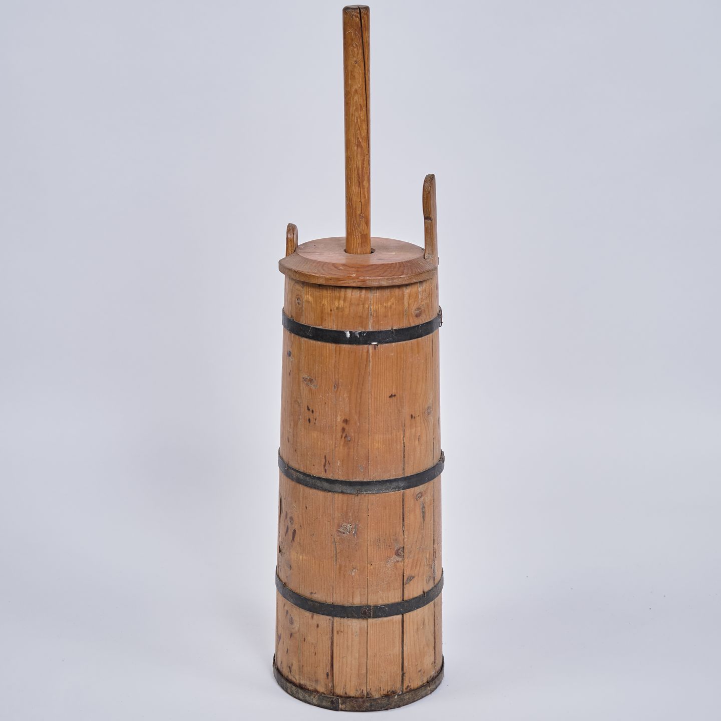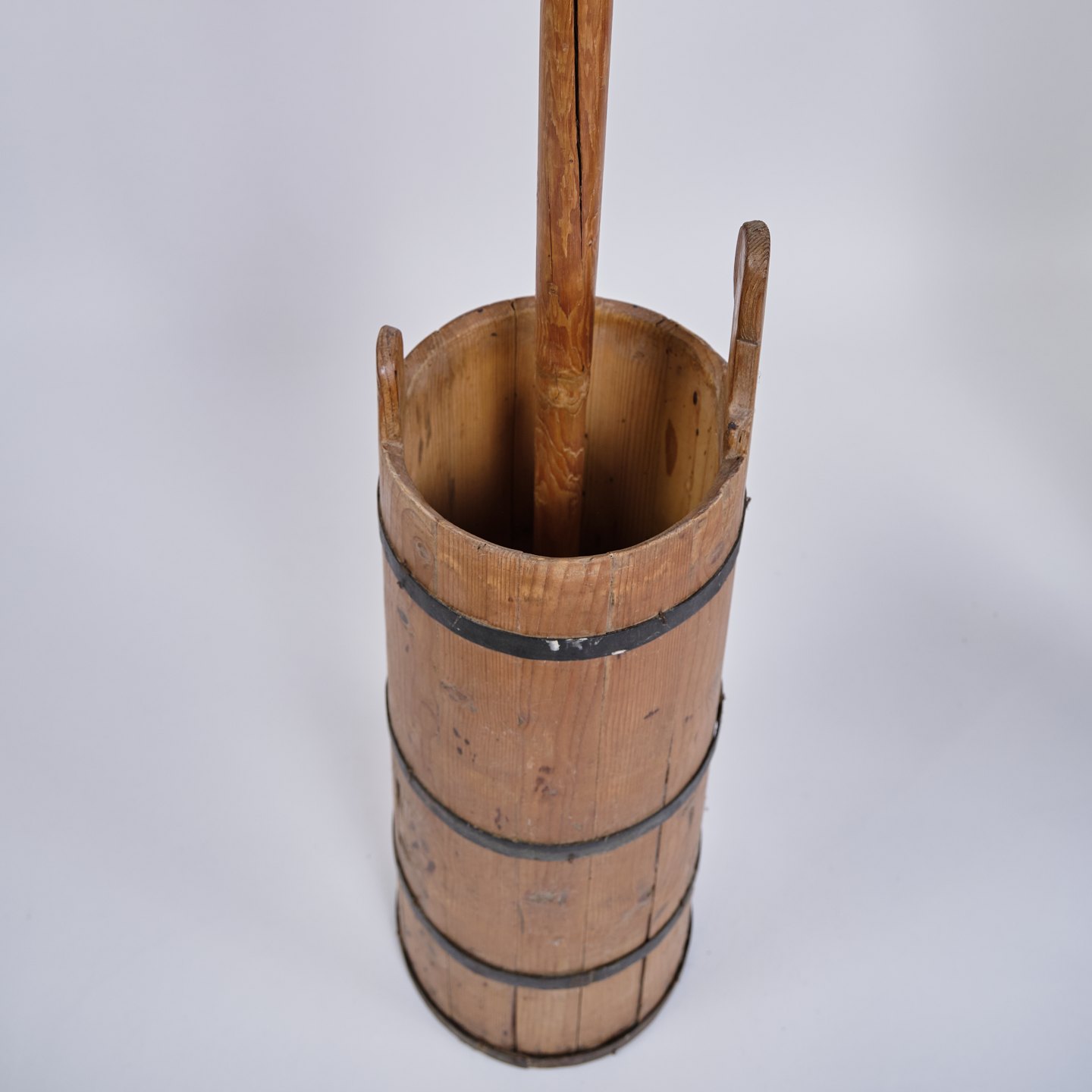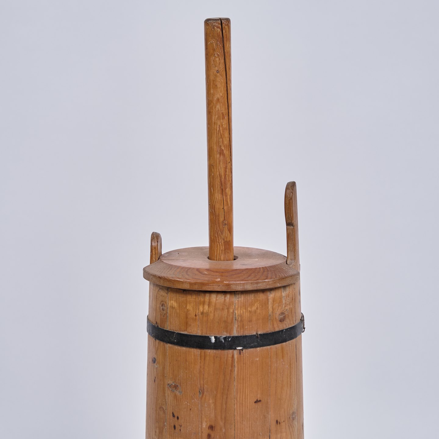 Antik smørkværner fra 1860’erne. Udført i egetræ med ståldetaljer. Højde 100 cm, diameter 25 cm. Evt. bruges til paraply holder.
