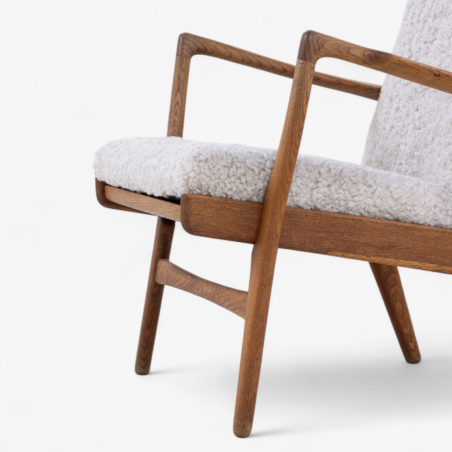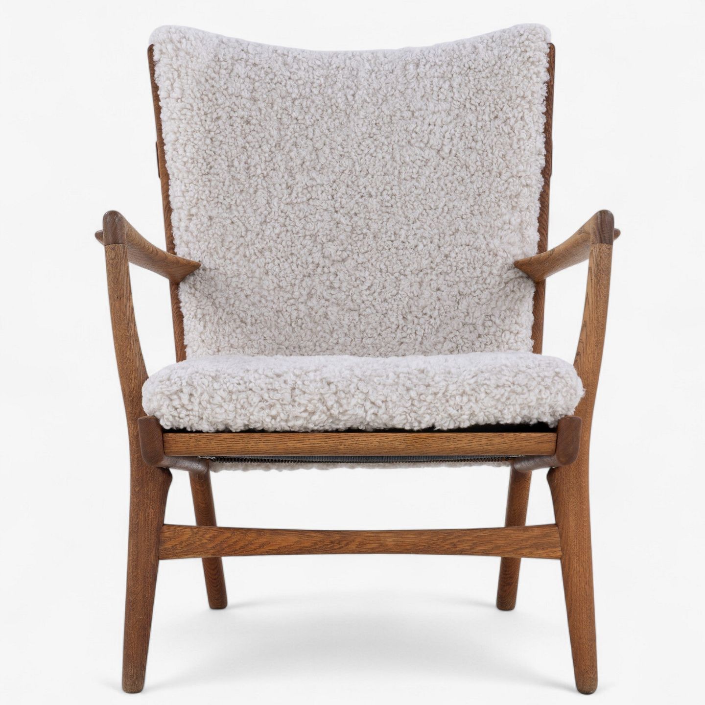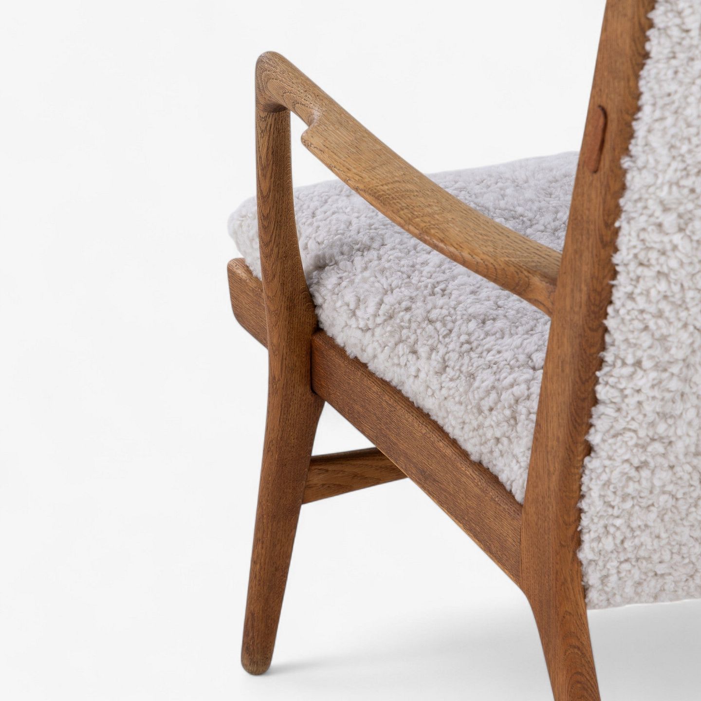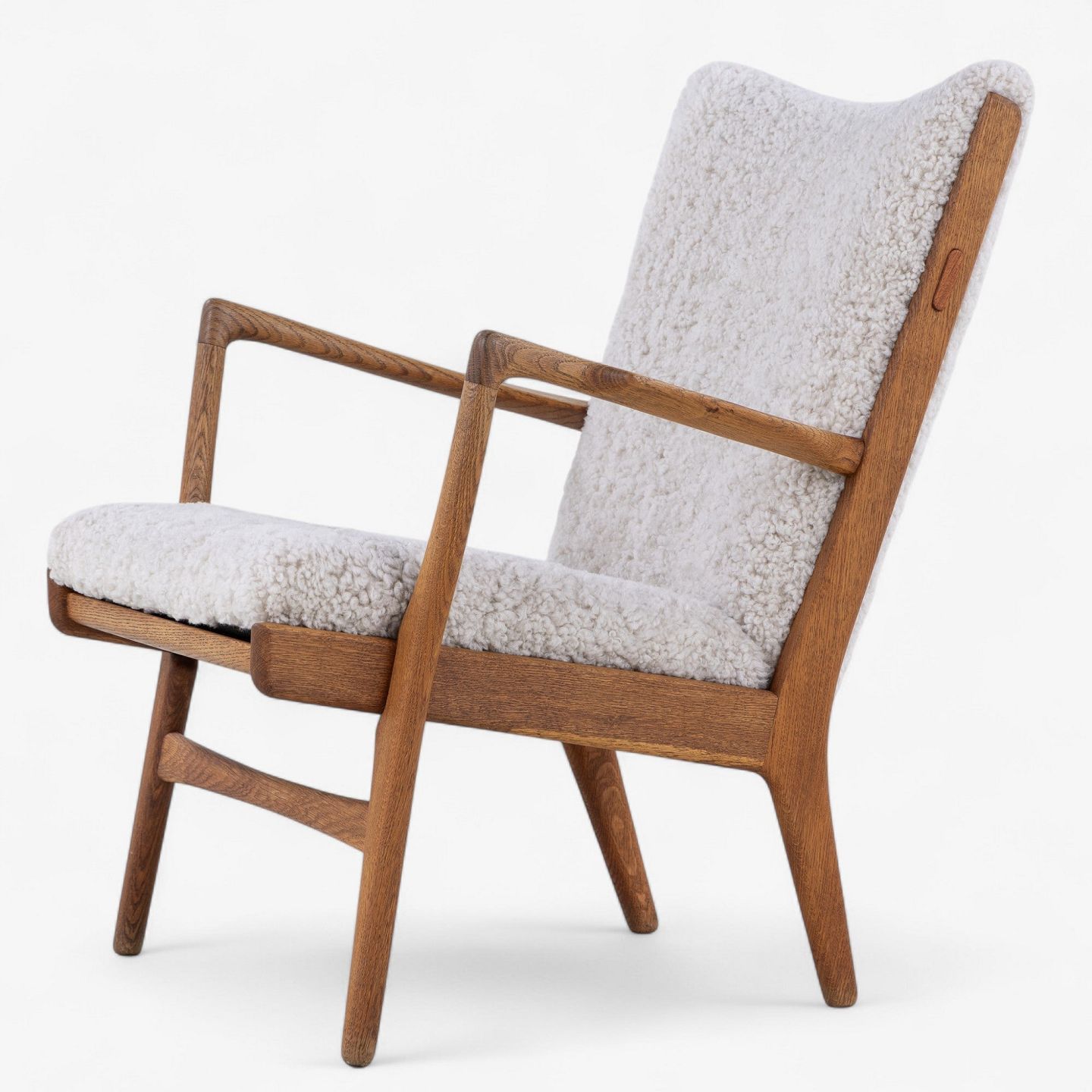 AP 16 - Lænestol betrukket i lammeskind (farve: Moonlight) med stel i patineret eg.