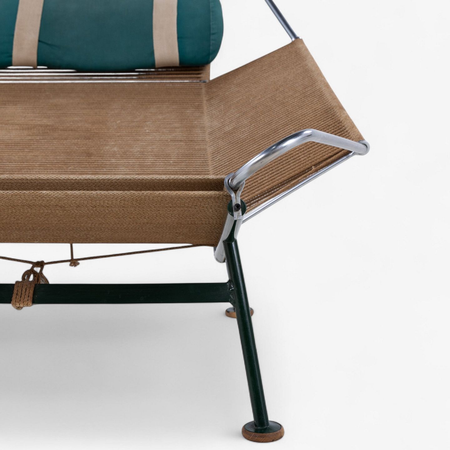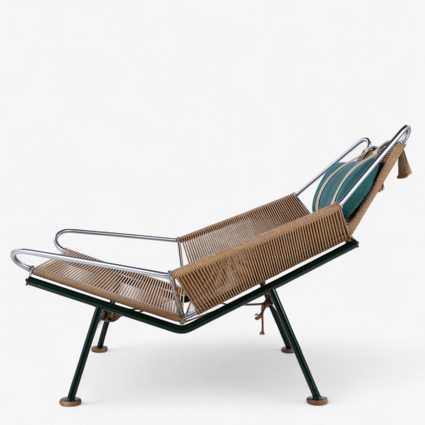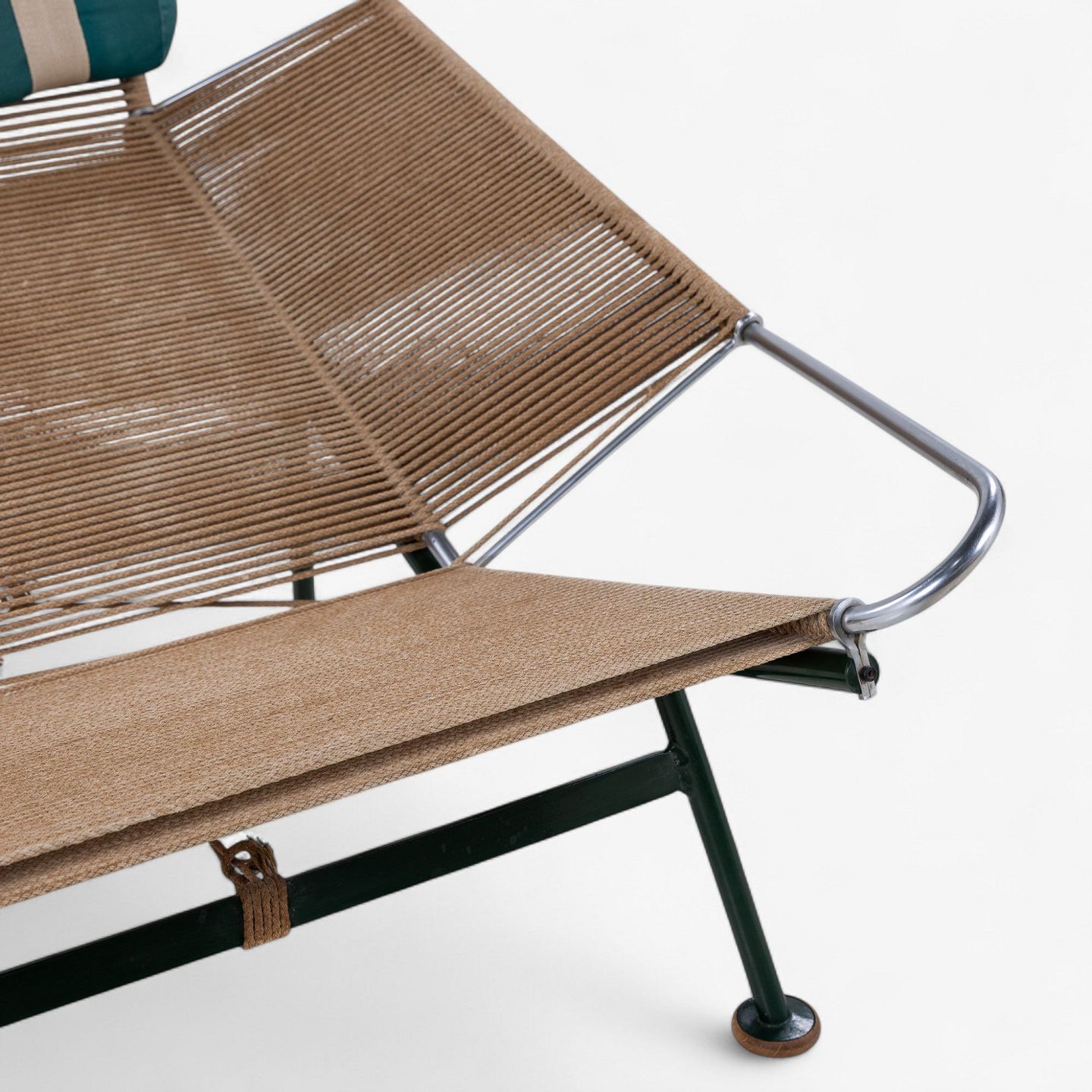 GE 225 - Tidlig 'Flaglinestol' med grønlakeret metalstel, originalt patineret flagline og grøn nakkehynde og sko af egetræ. Formgivet i 1950.