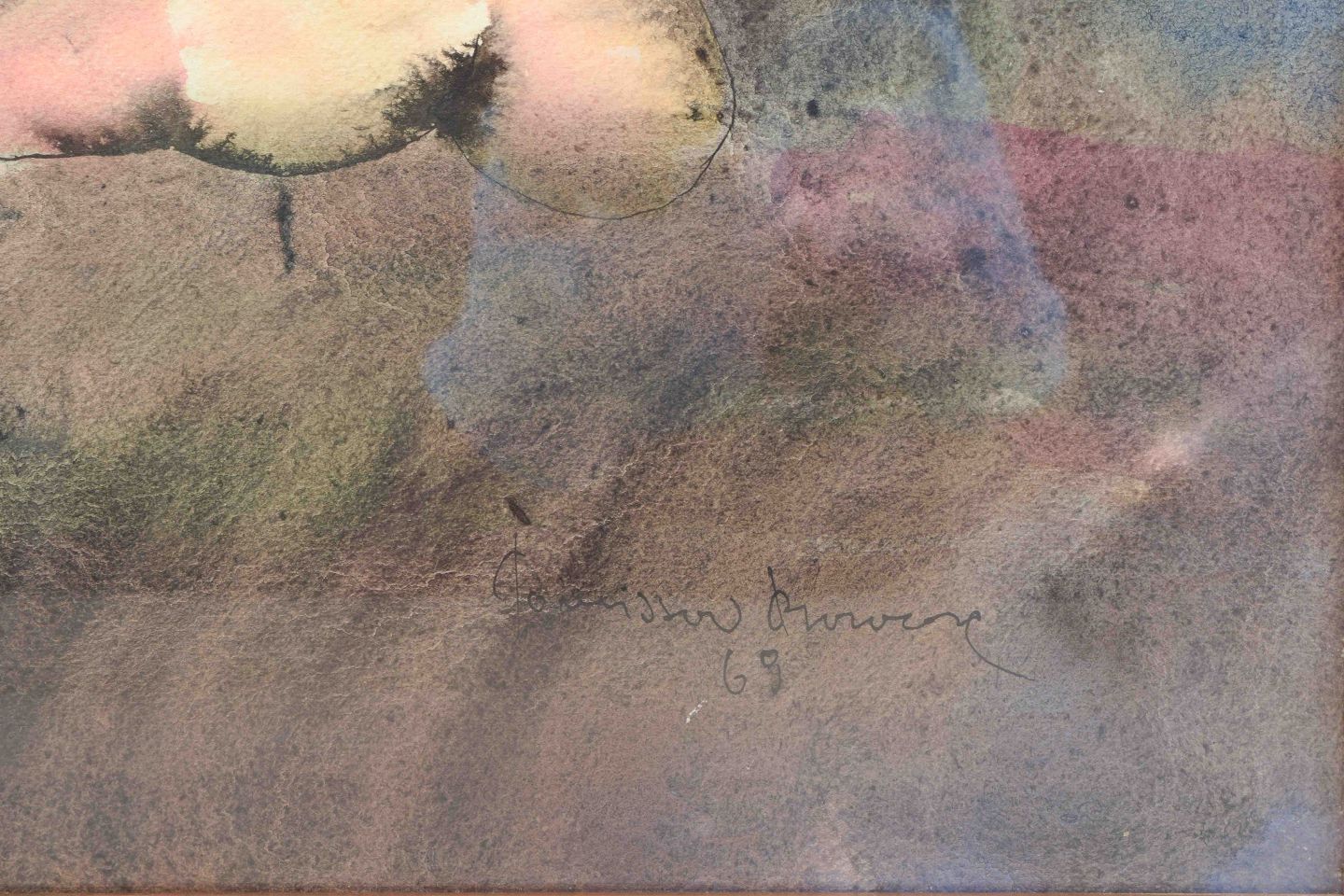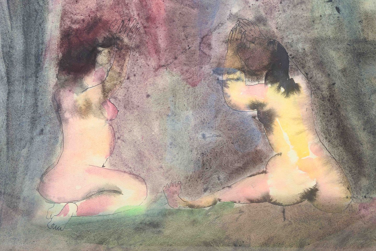 Et ekspressivt værk udført i blandteknik, hvor to nøgne kvinder i siddende stilling – nærmest i en yoga- eller gymnastisk positur – er placeret i forgrunden foran en drømmeagtig, farvemættet baggrund. Arbejdet bærer titlen “Begråtande” og fremstår med en utydelig signatur.