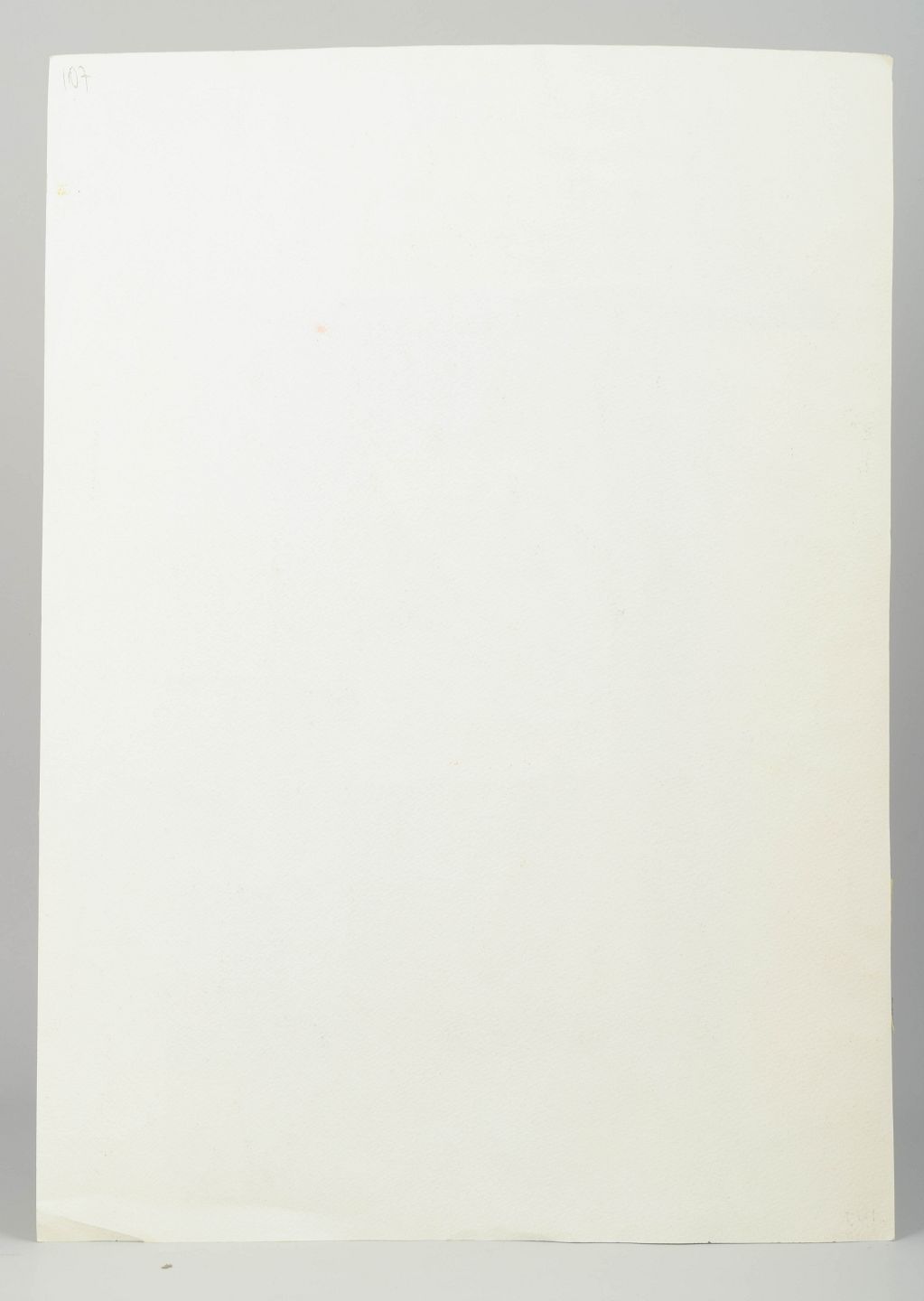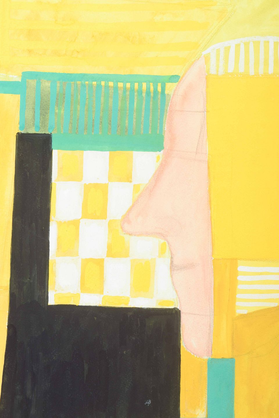Et farverigt gouachemaleri af Osmund Hansen, med en abstrakt komposition i gule, sorte og rosa nuancer, kombineret med geometriske mønstre.