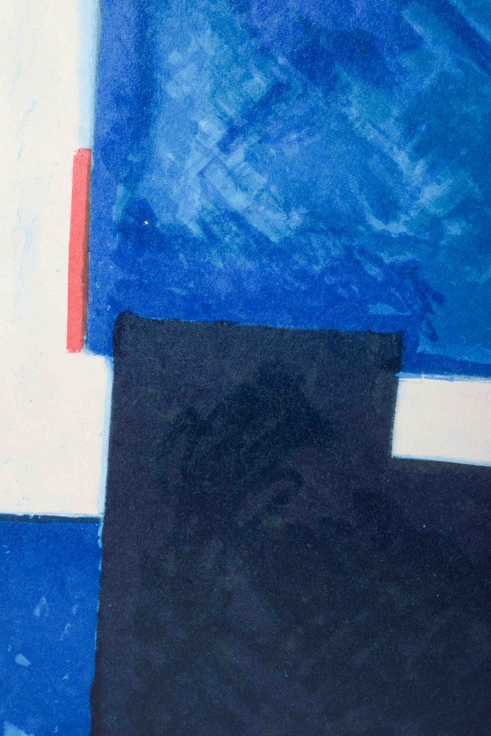 Et ekspressivt litografi af Osmund Hansen med geometriske former i blå og mørke nuancer, trykt på kraftigt papir. Værket er usigneret.