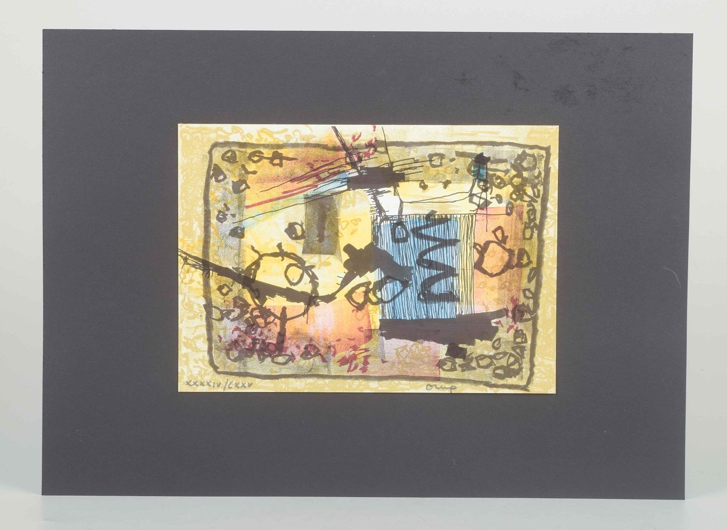 Et karakteristisk abstrakt værk af den svenske kunstner og designer Bengt Orup, kendt for sine modernistiske glasarbejder hos Johansfors Glasbruk samt grafiske kompositioner.