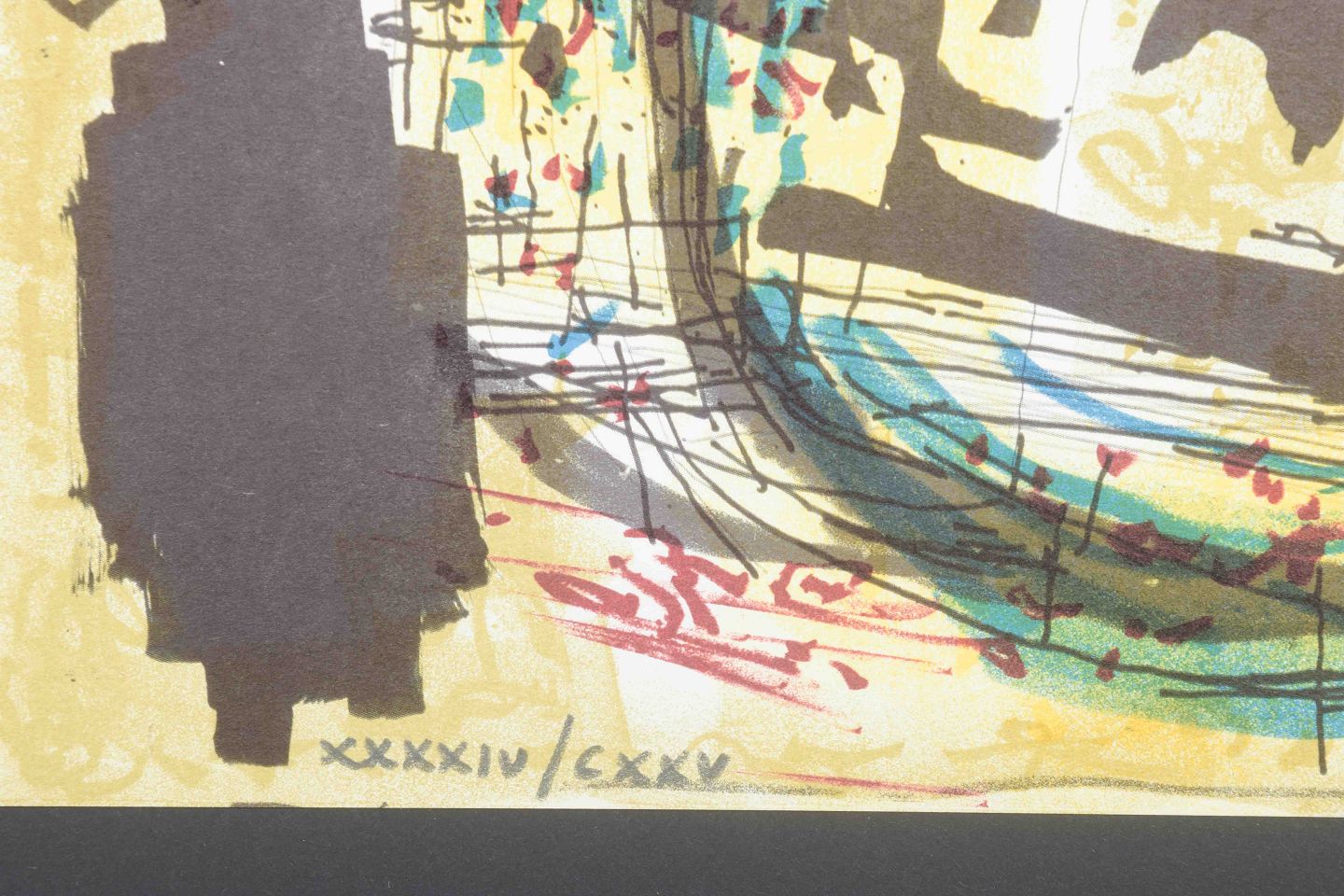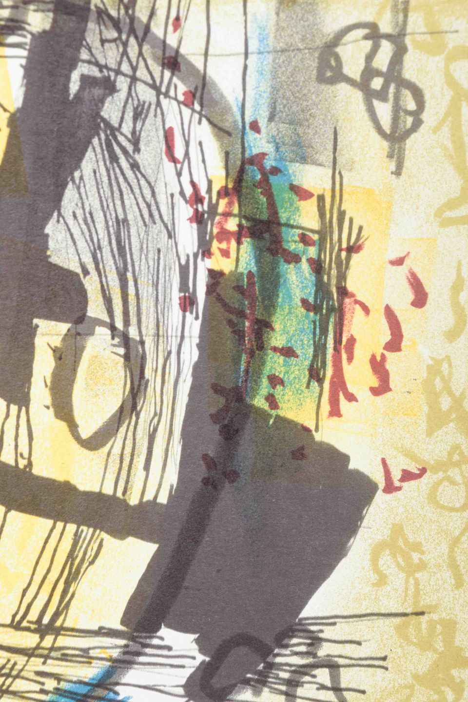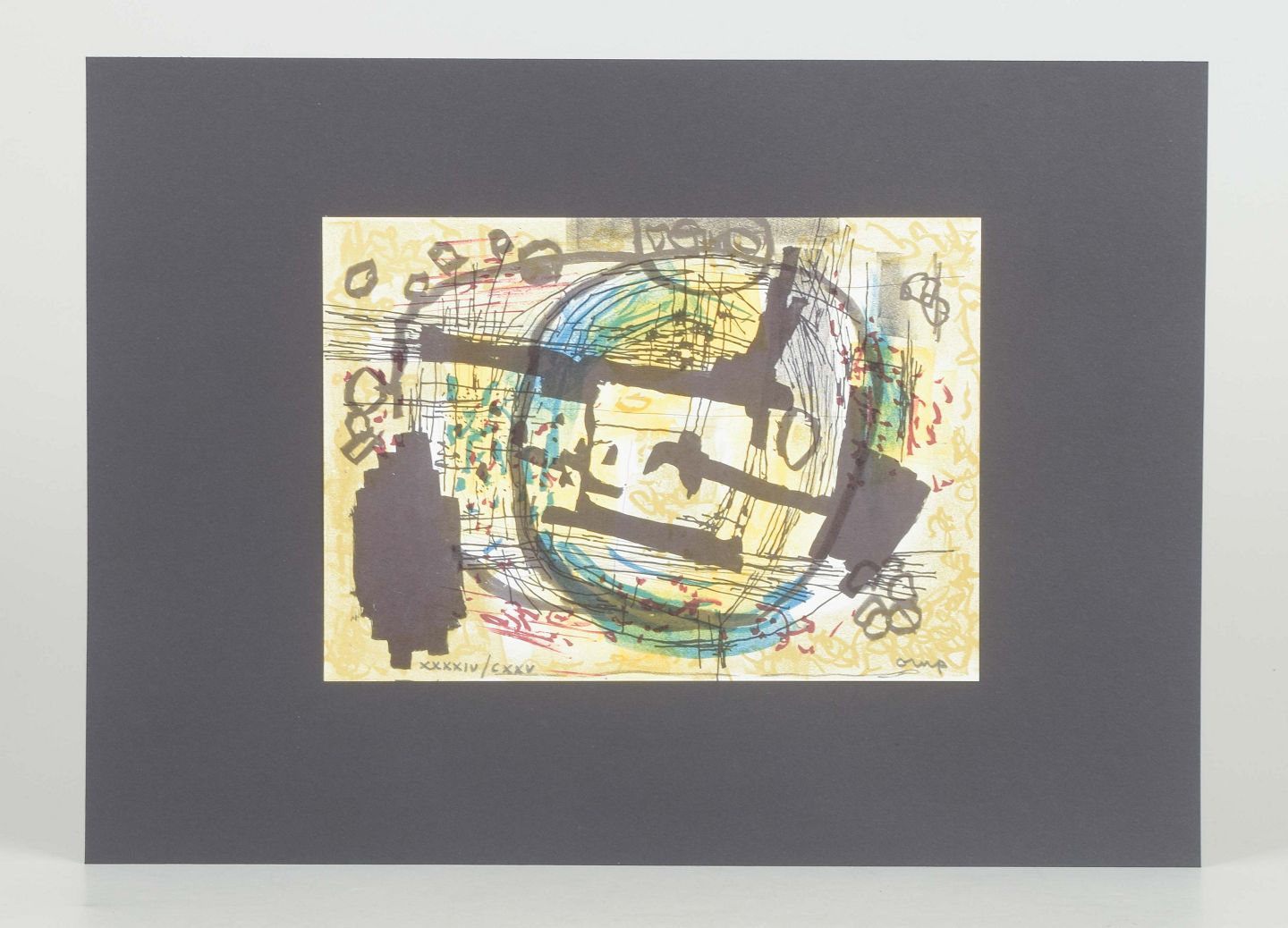 Et karakteristisk abstrakt værk af den svenske kunstner og designer Bengt Orup, kendt for sine modernistiske glasarbejder hos Johansfors Glasbruk samt grafiske kompositioner.