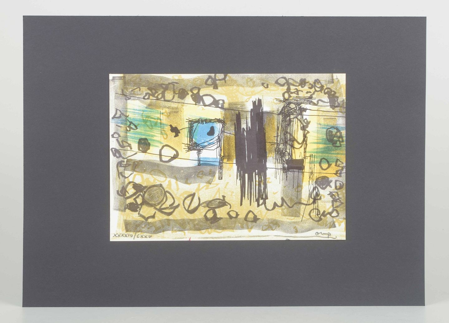 Et karakteristisk abstrakt værk af den svenske kunstner og designer Bengt Orup, kendt for sine modernistiske glasarbejder hos Johansfors Glasbruk samt grafiske kompositioner.