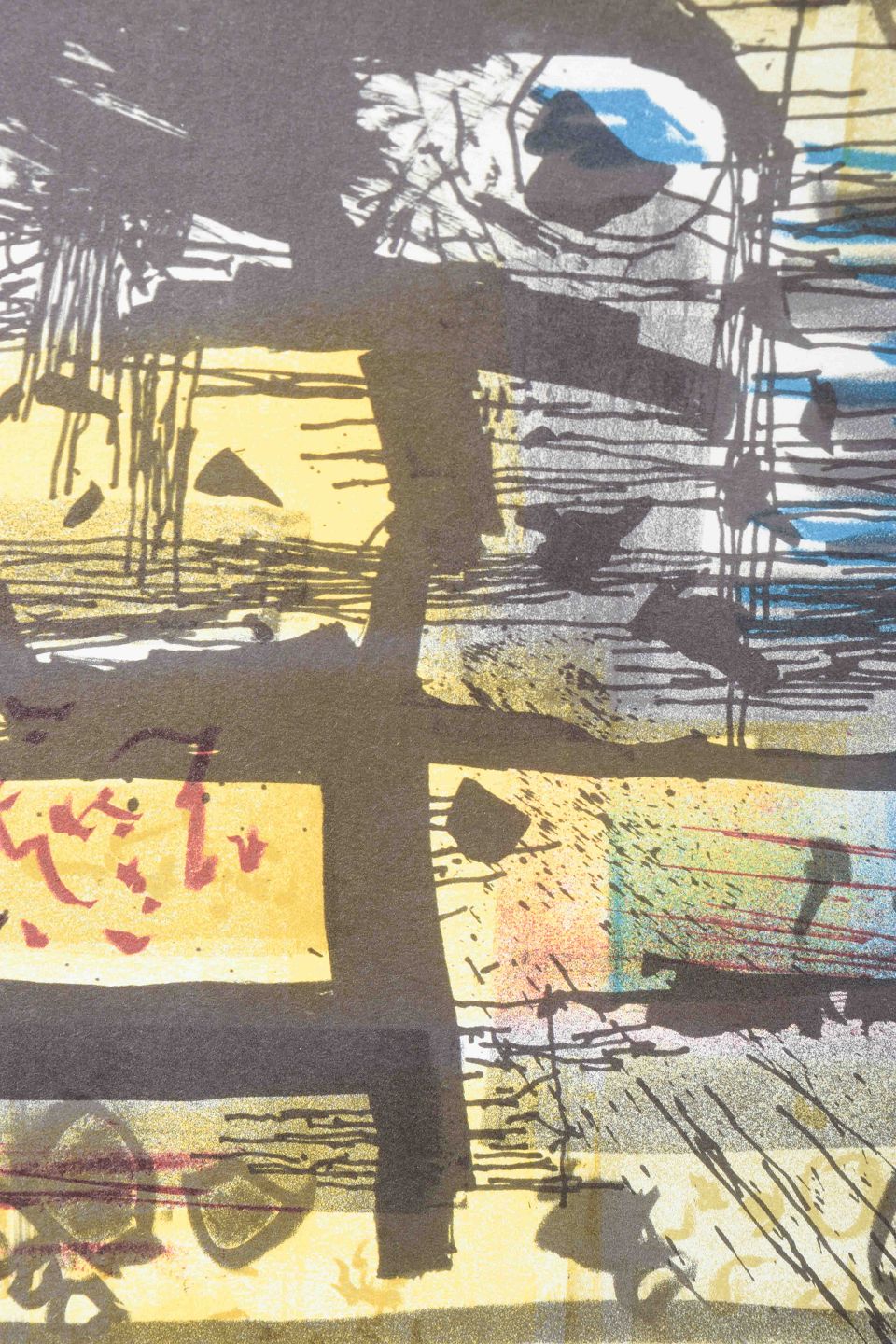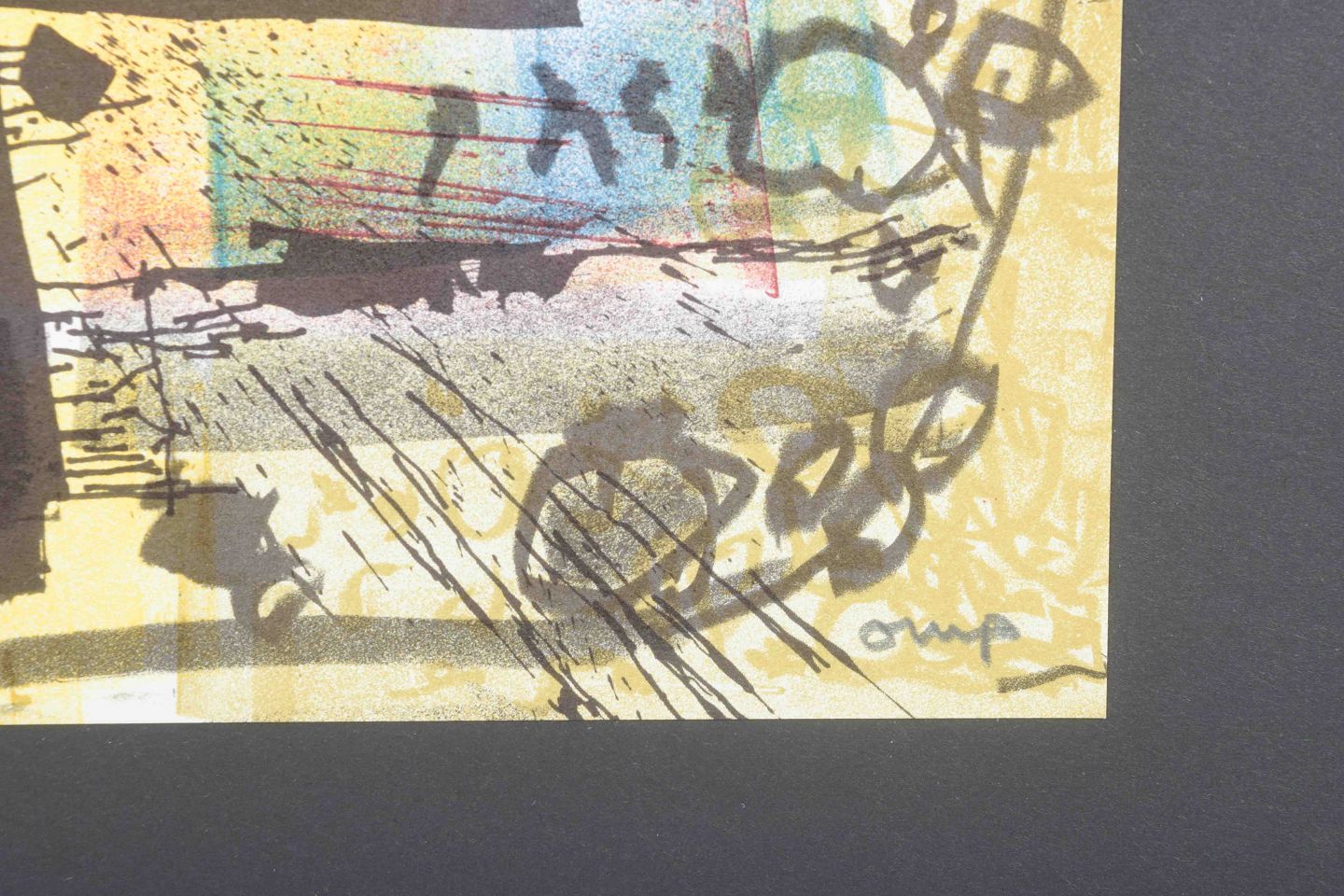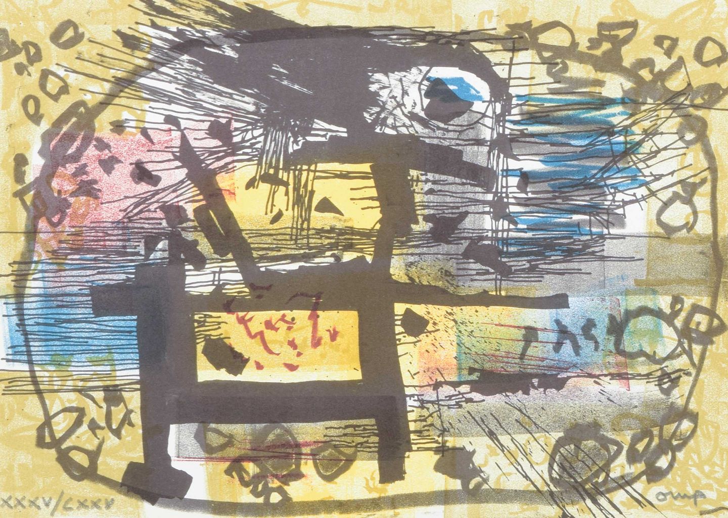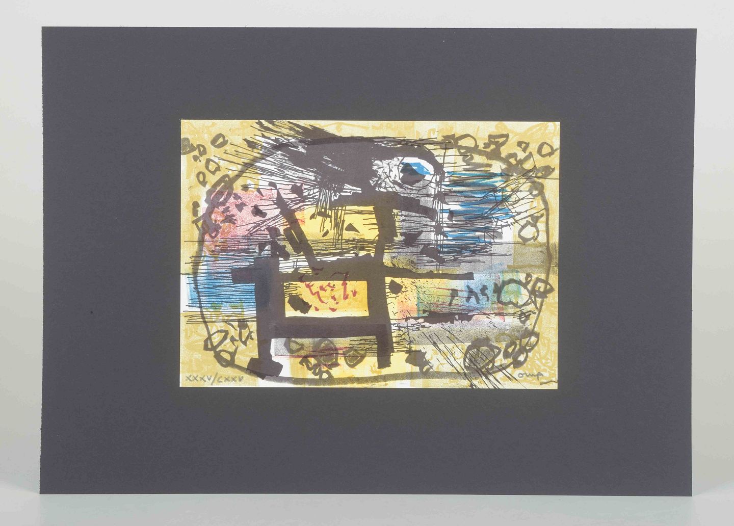 Et karakteristisk abstrakt værk af den svenske kunstner og designer Bengt Orup, kendt for sine modernistiske glasarbejder hos Johansfors Glasbruk samt grafiske kompositioner.