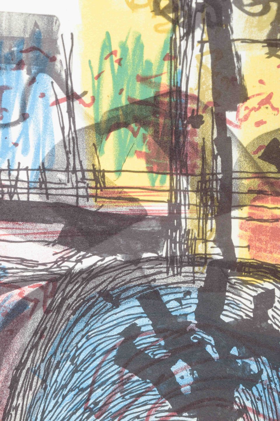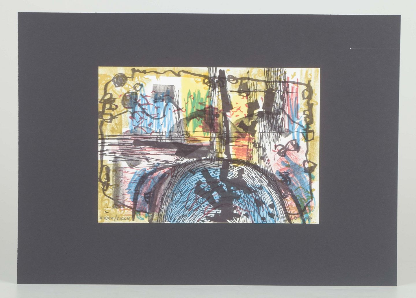 Et karakteristisk abstrakt værk af den svenske kunstner og designer Bengt Orup, kendt for sine modernistiske glasarbejder hos Johansfors Glasbruk samt grafiske kompositioner.