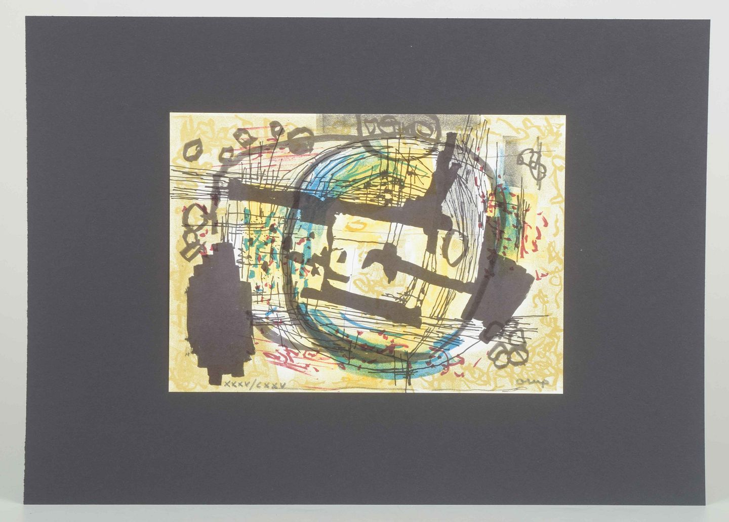 Et karakteristisk abstrakt værk af den svenske kunstner og designer Bengt Orup, kendt for sine modernistiske glasarbejder hos Johansfors Glasbruk samt grafiske kompositioner.