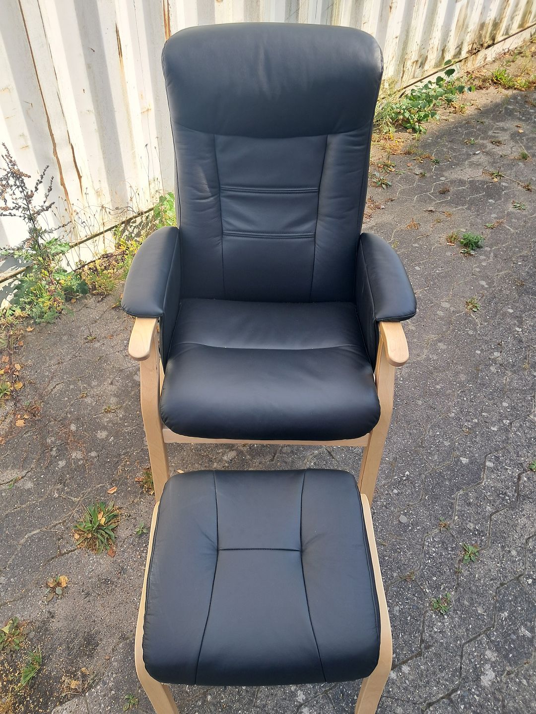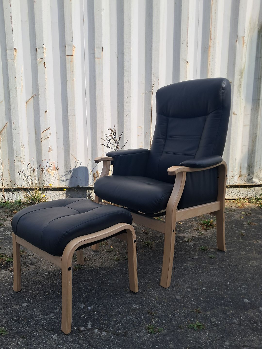 Lænestol og skammel i bøgetræ med læderbetræk, fra 2000erne.