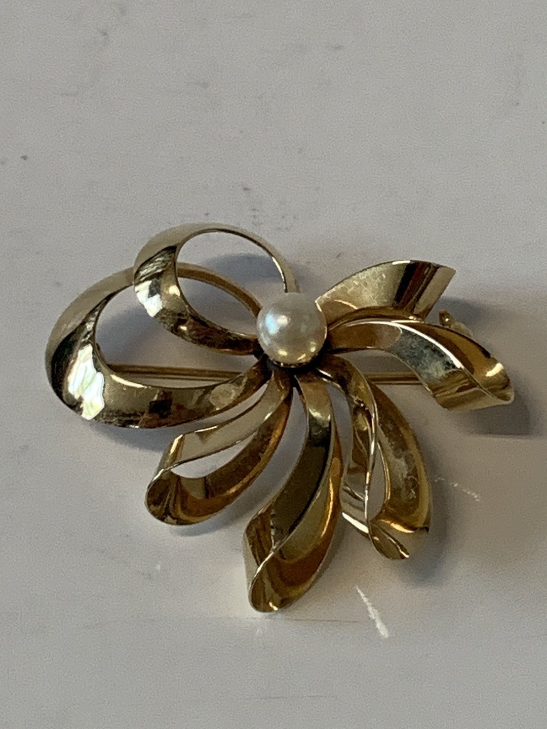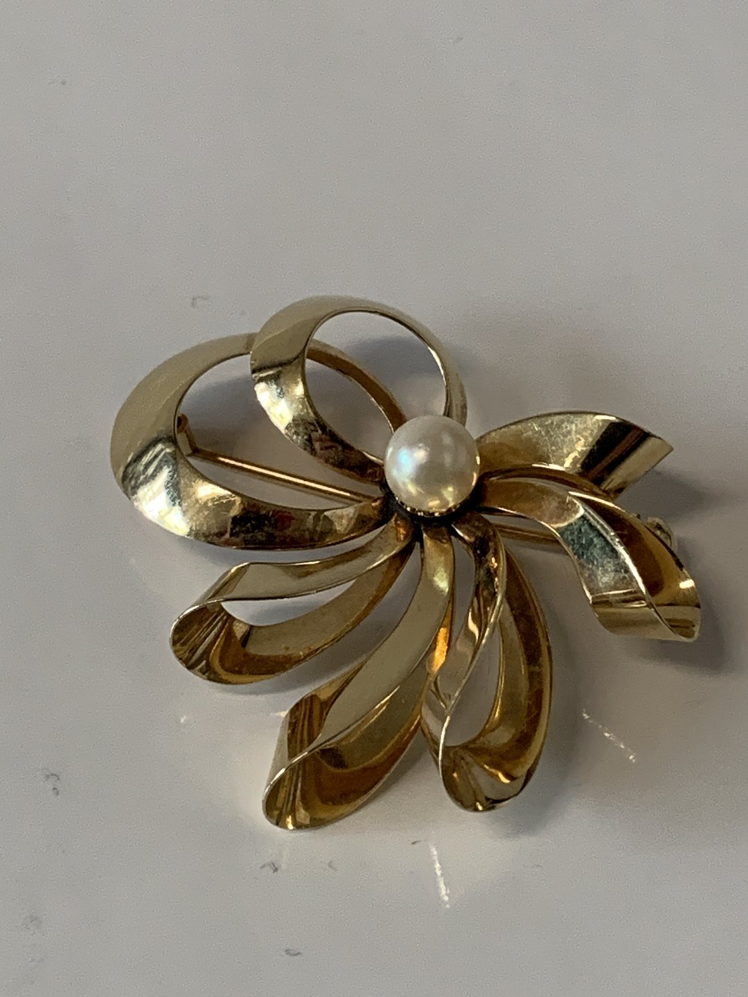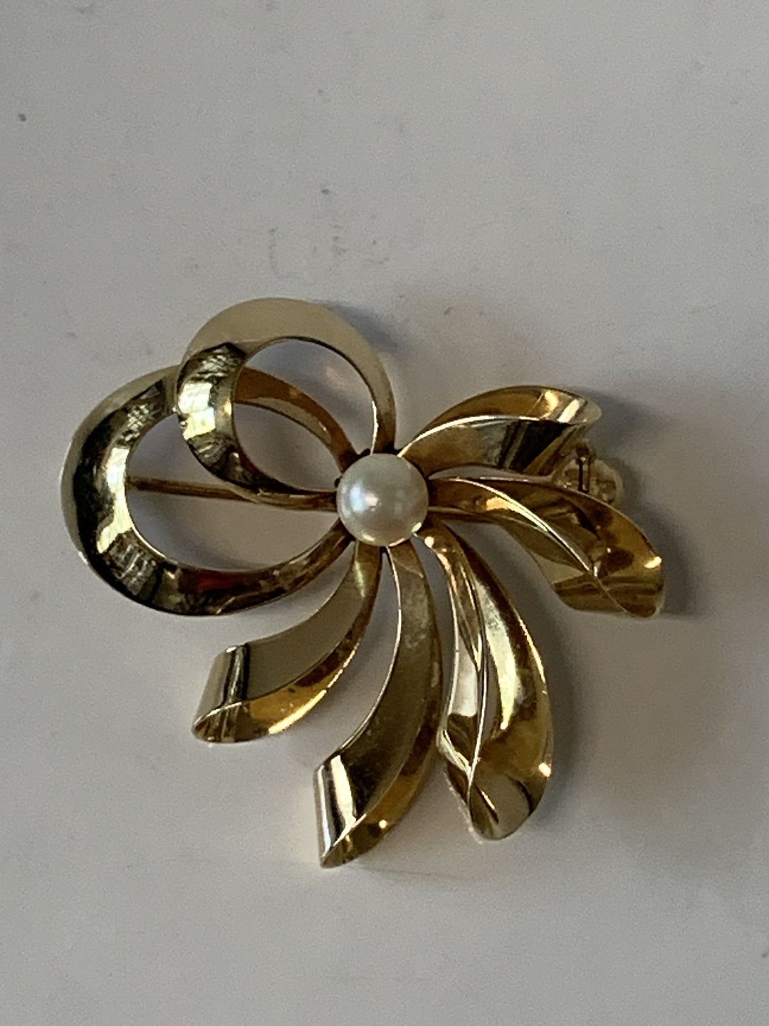 Smuk guldbroche med bløde linjer i 14 karat guld, med ægte perle.