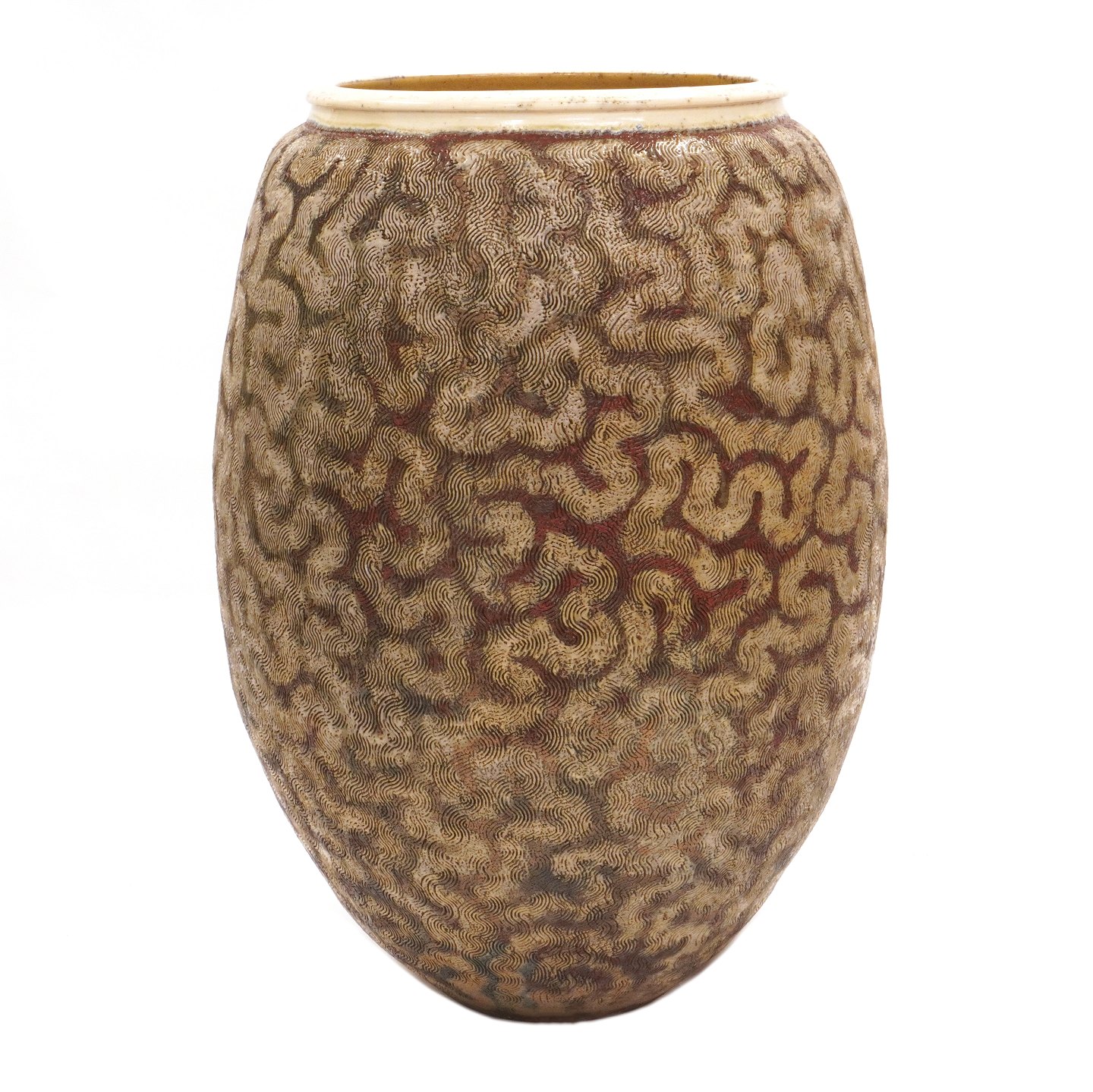Kolossal Per Weiss stentøjsvase med ornamental relief dekoration med rød og grøn glasur