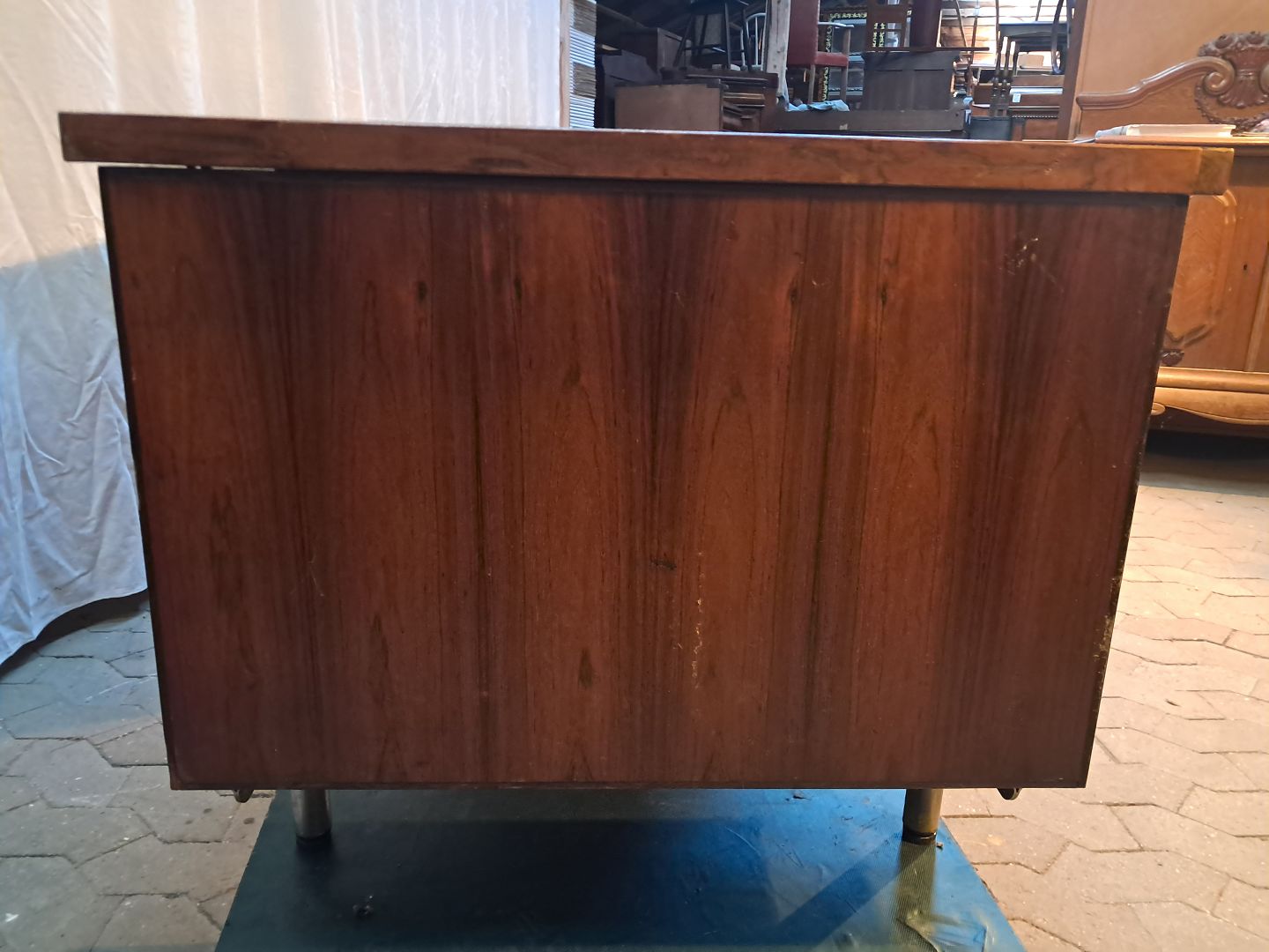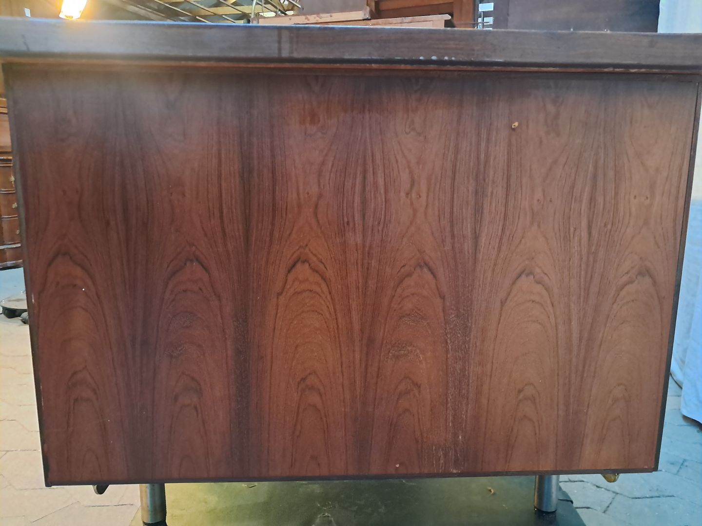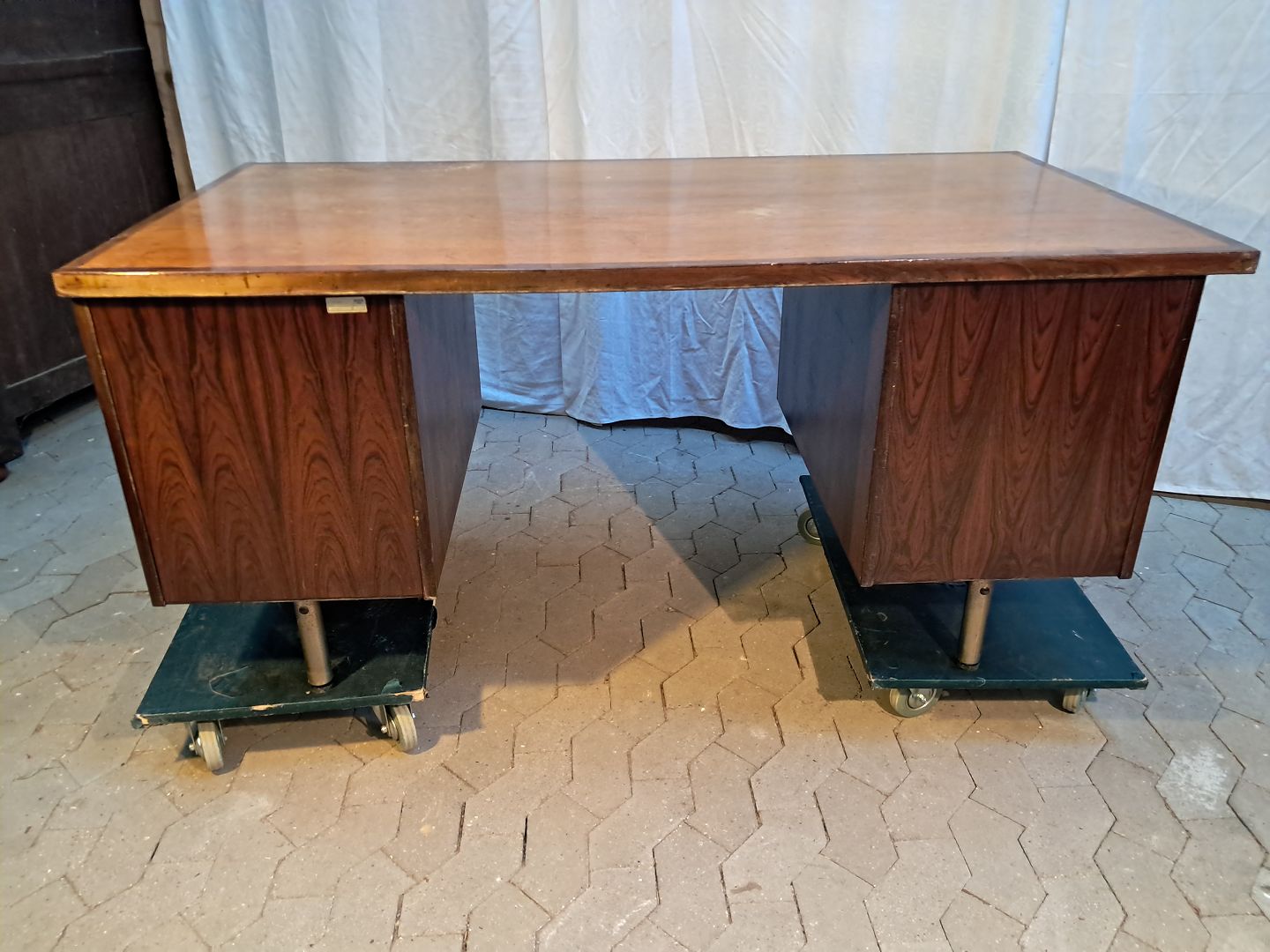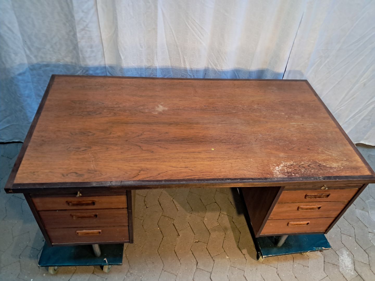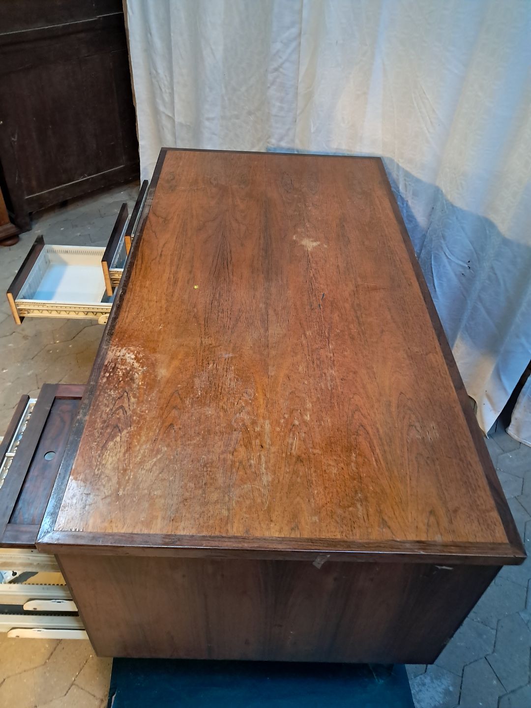 Text available in Danish: Skrivebord i fineret palisander, fra 1980erne.