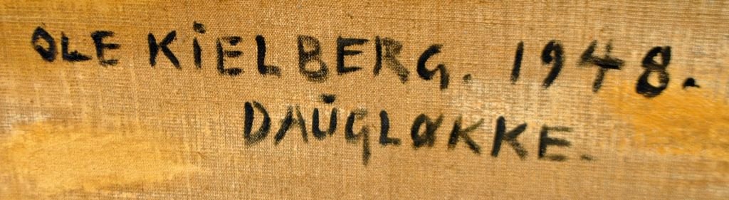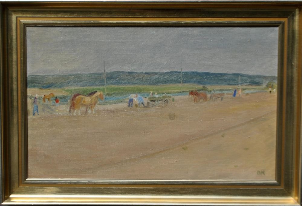 Kielberg, Ole (1911 - 1985) Danmark: Pløjning, 1948. Olie på lærred. Signeret: OK og bagpå: Ole Kielberg Daugløkke 1948. H: 38 cm. B: 61 cm.