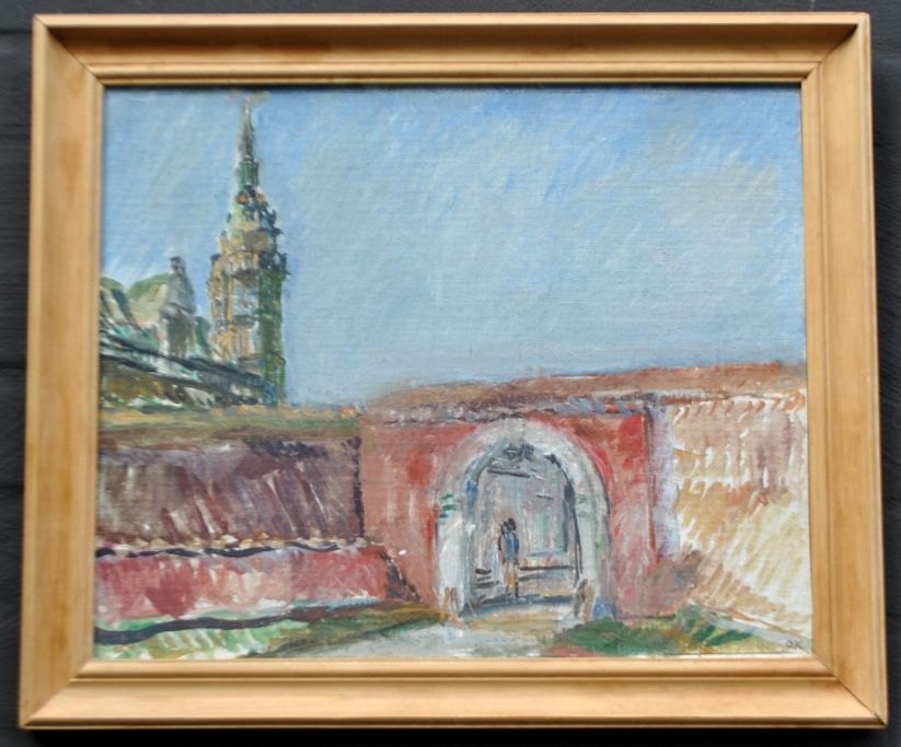 Kielberg, Ole (1911 - 1985) Danmark: Rød port. Kronborg, 1966-68. Olie på massonit. Signeret: OK og bagpå: Ole Kielberg. Kronborg. 1966-68. H: 35 cm. B: 42,5 cm.