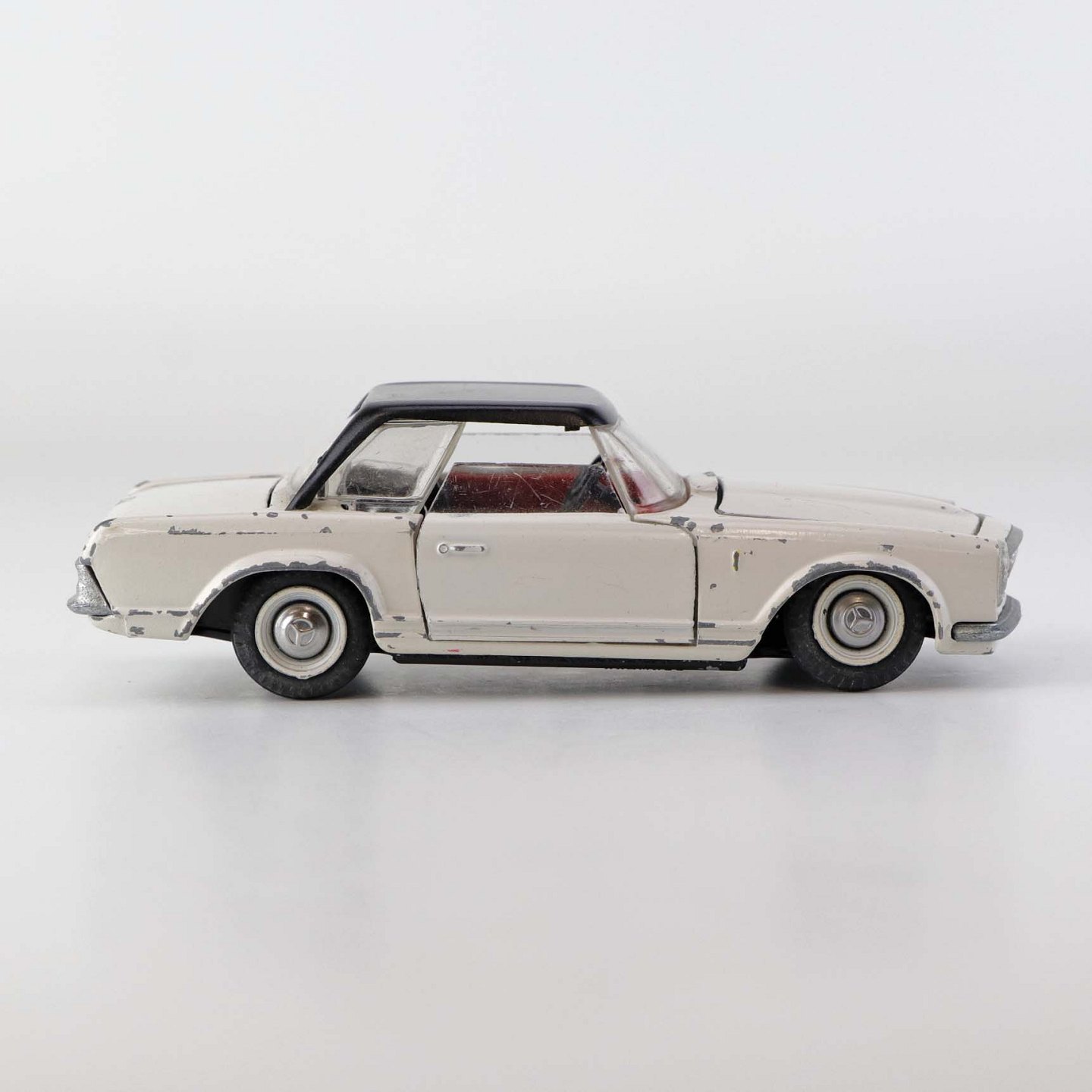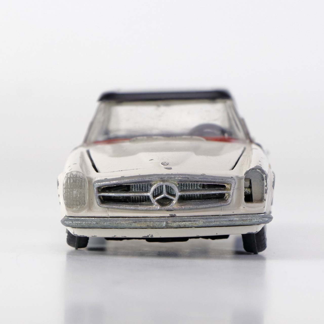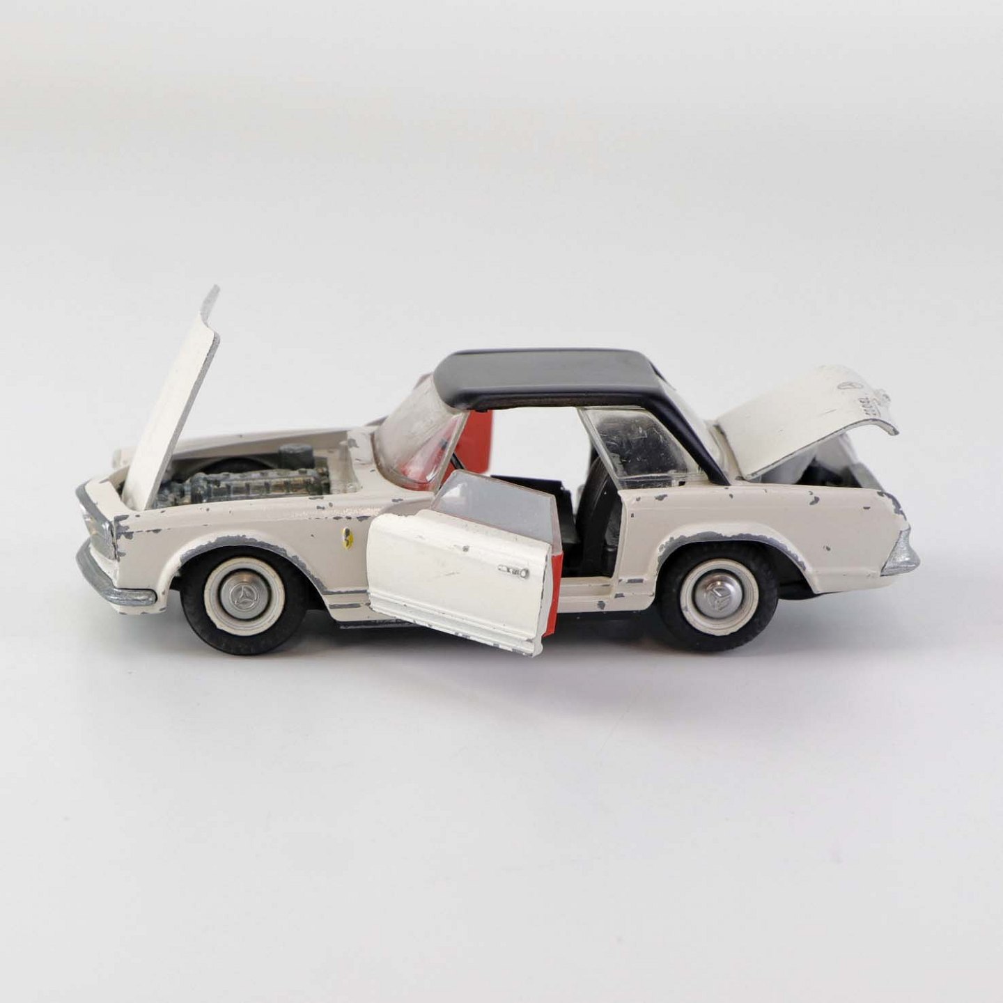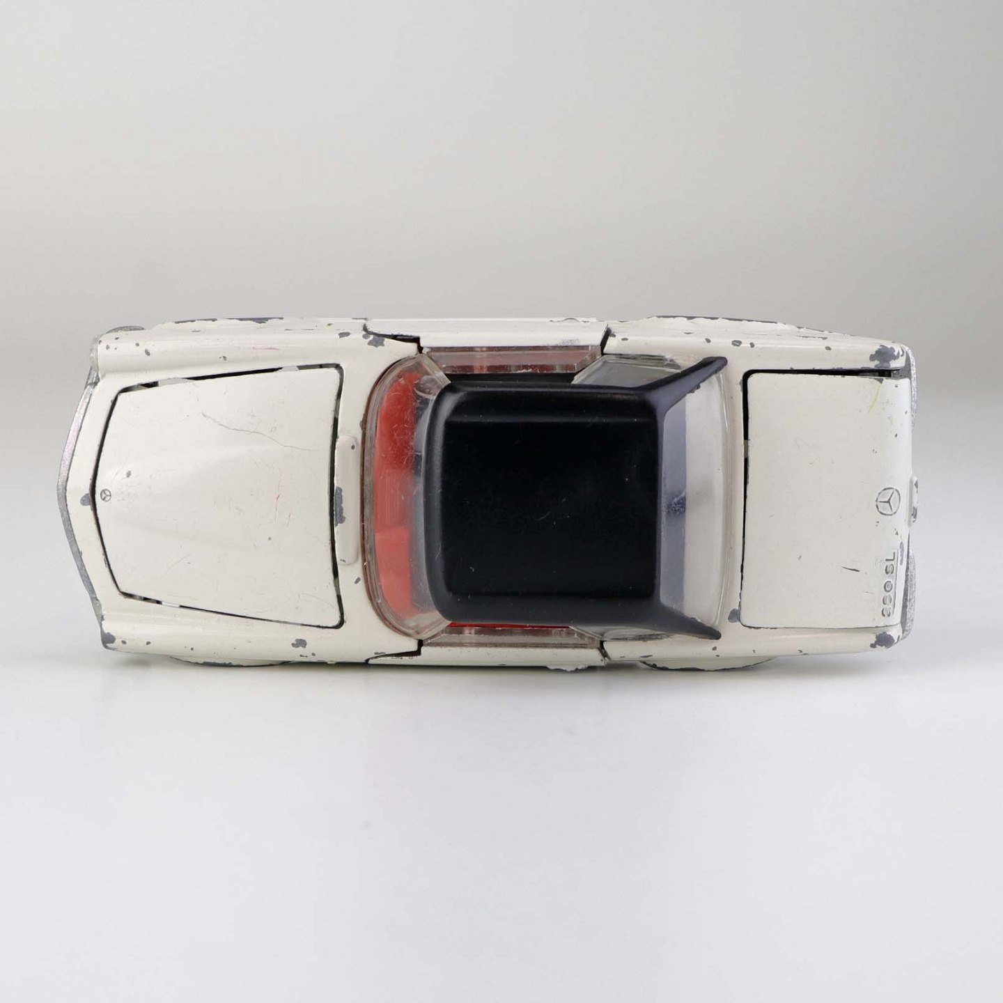 Hvid Mercedes-Benz 280 SL legetøjsbil med sort tag i lakeret metal med gummi hjul. Motorhjelm, bagklap og begge frontdører kan åbnes.
