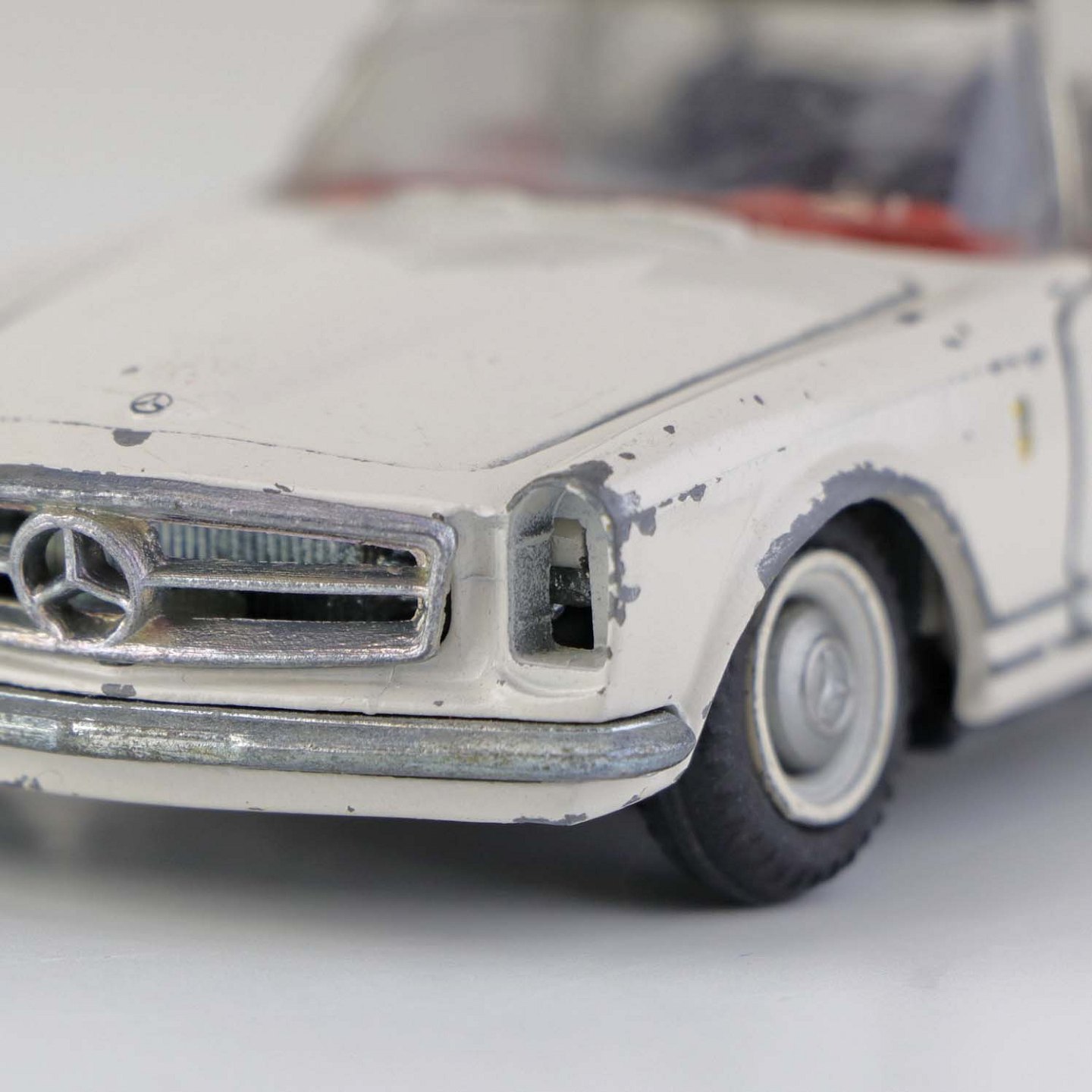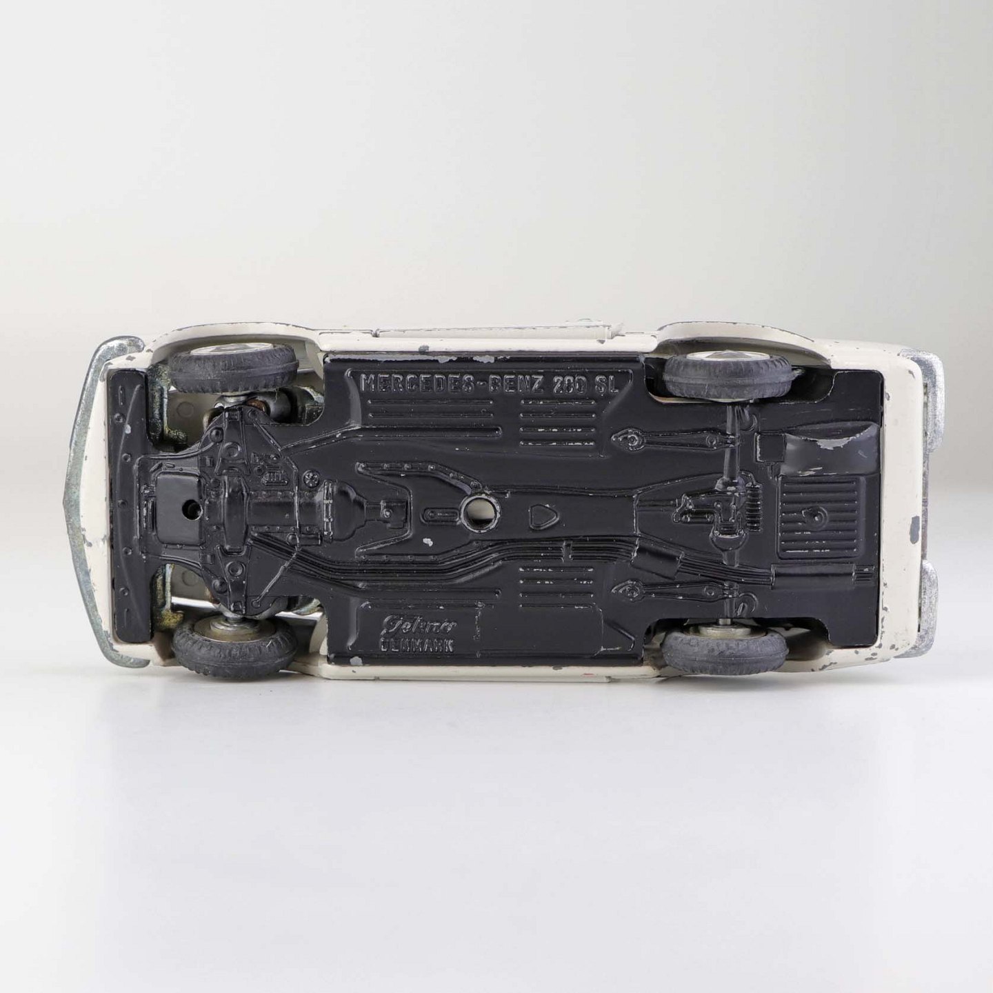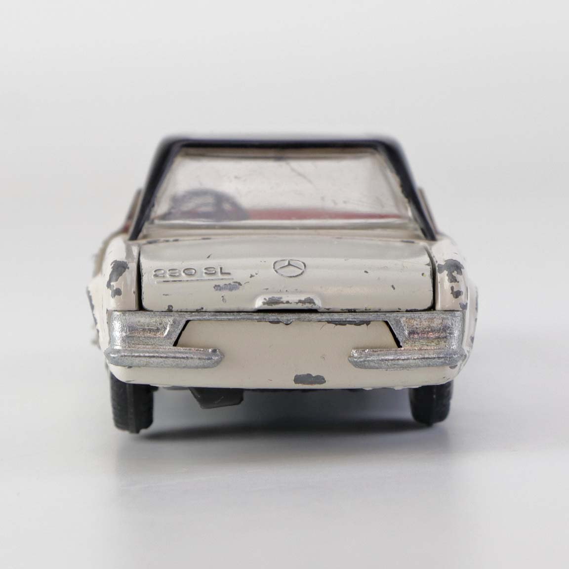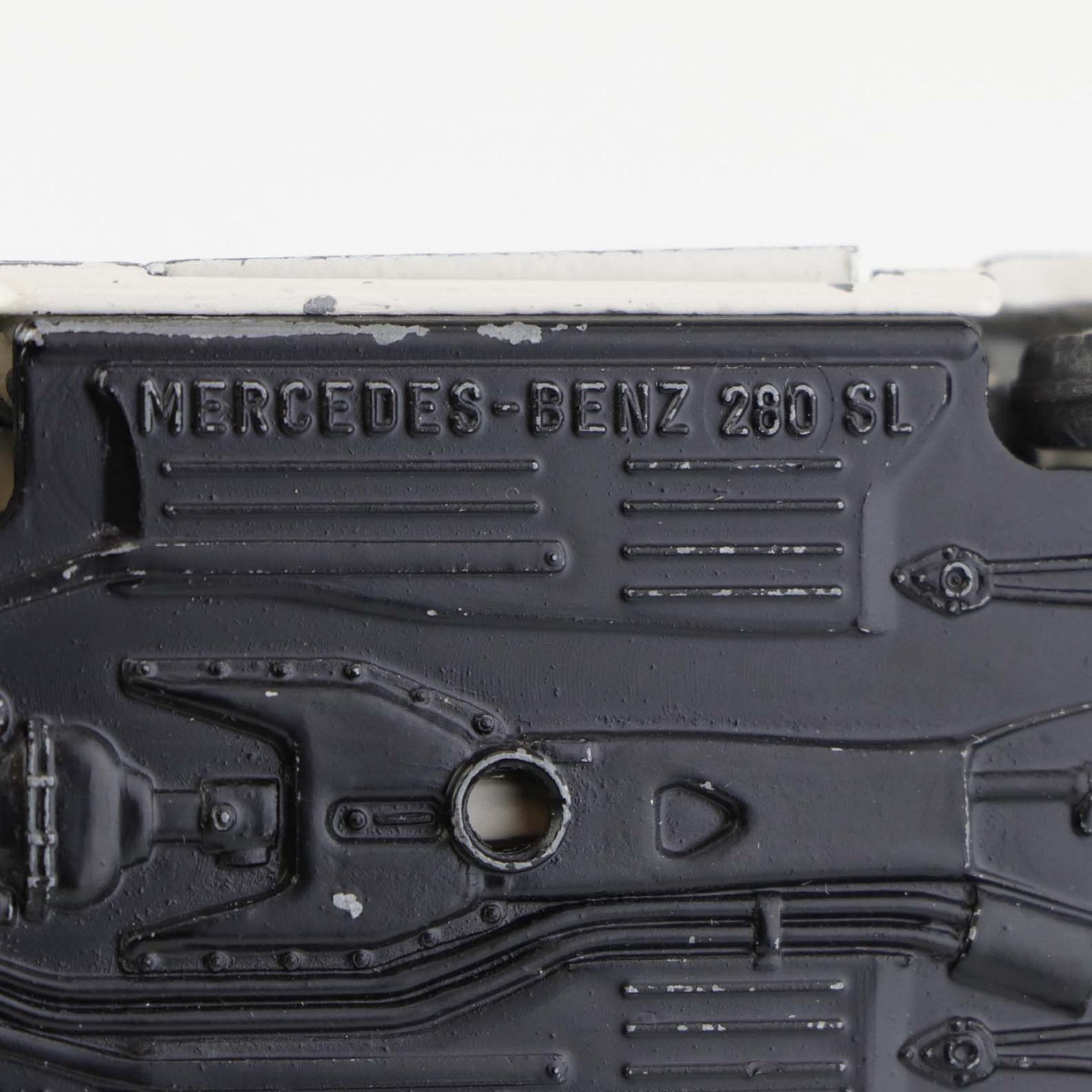 Hvid Mercedes-Benz 280 SL legetøjsbil med sort tag i lakeret metal med gummi hjul. Motorhjelm, bagklap og begge frontdører kan åbnes.