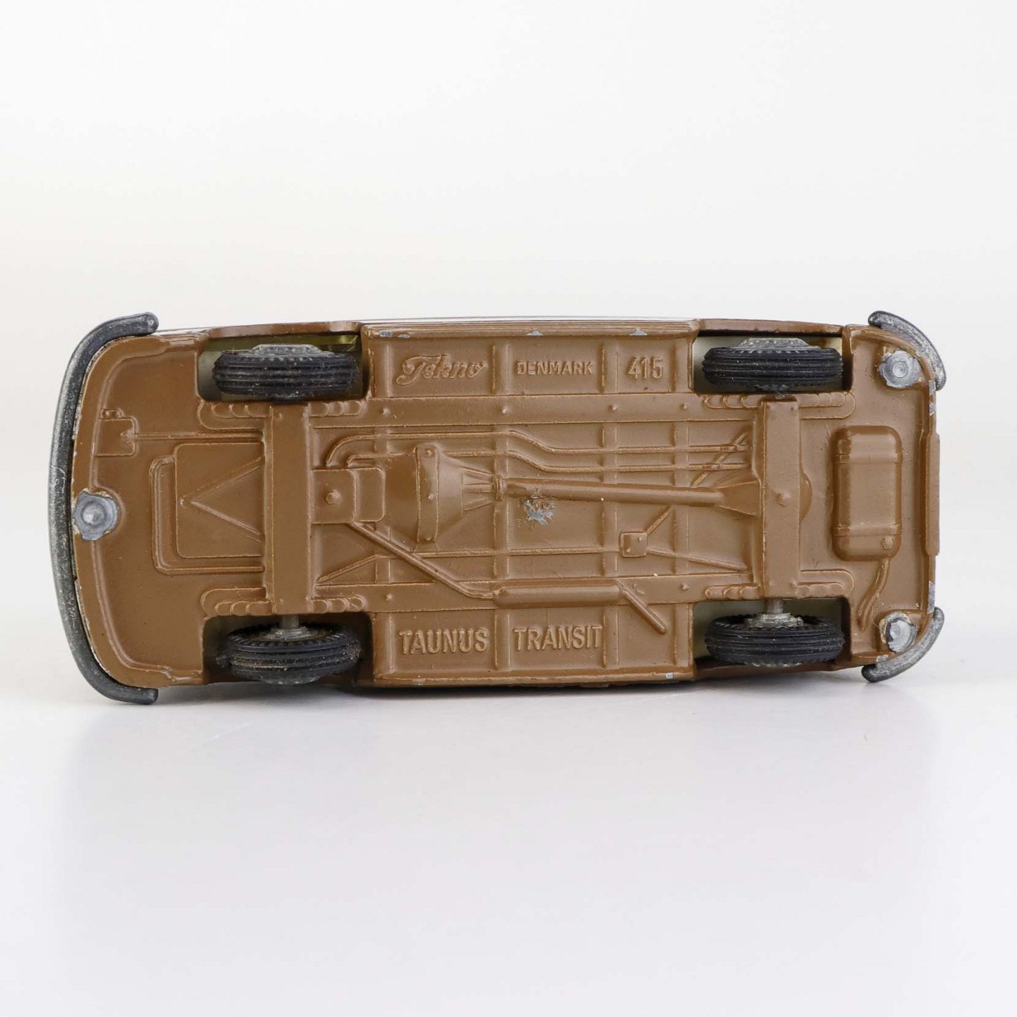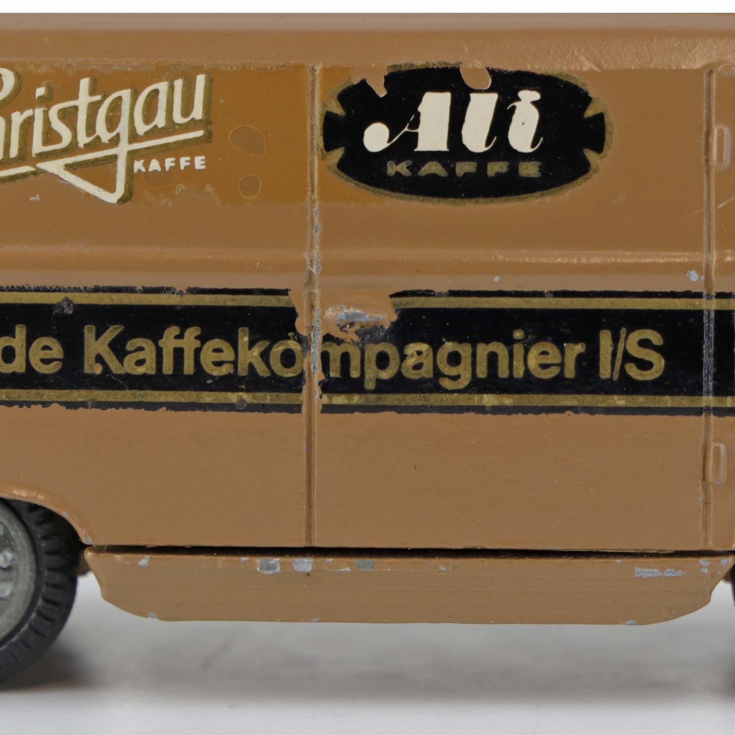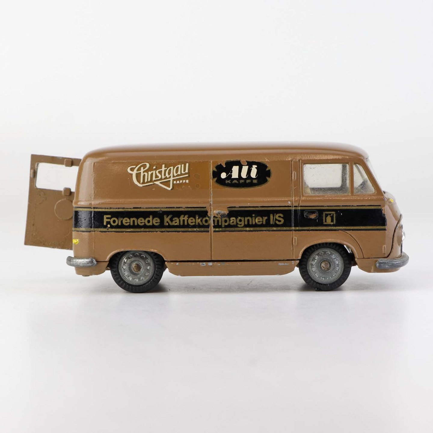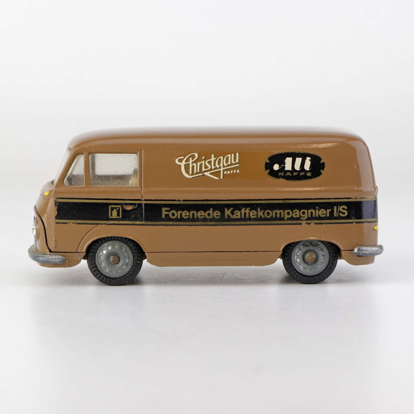 Taunus Transit legetøjsbil i brunlakeret metal med gummi hjul og teksten Ali Kaffe, Forenede kaffekompagnier. Nr. 415