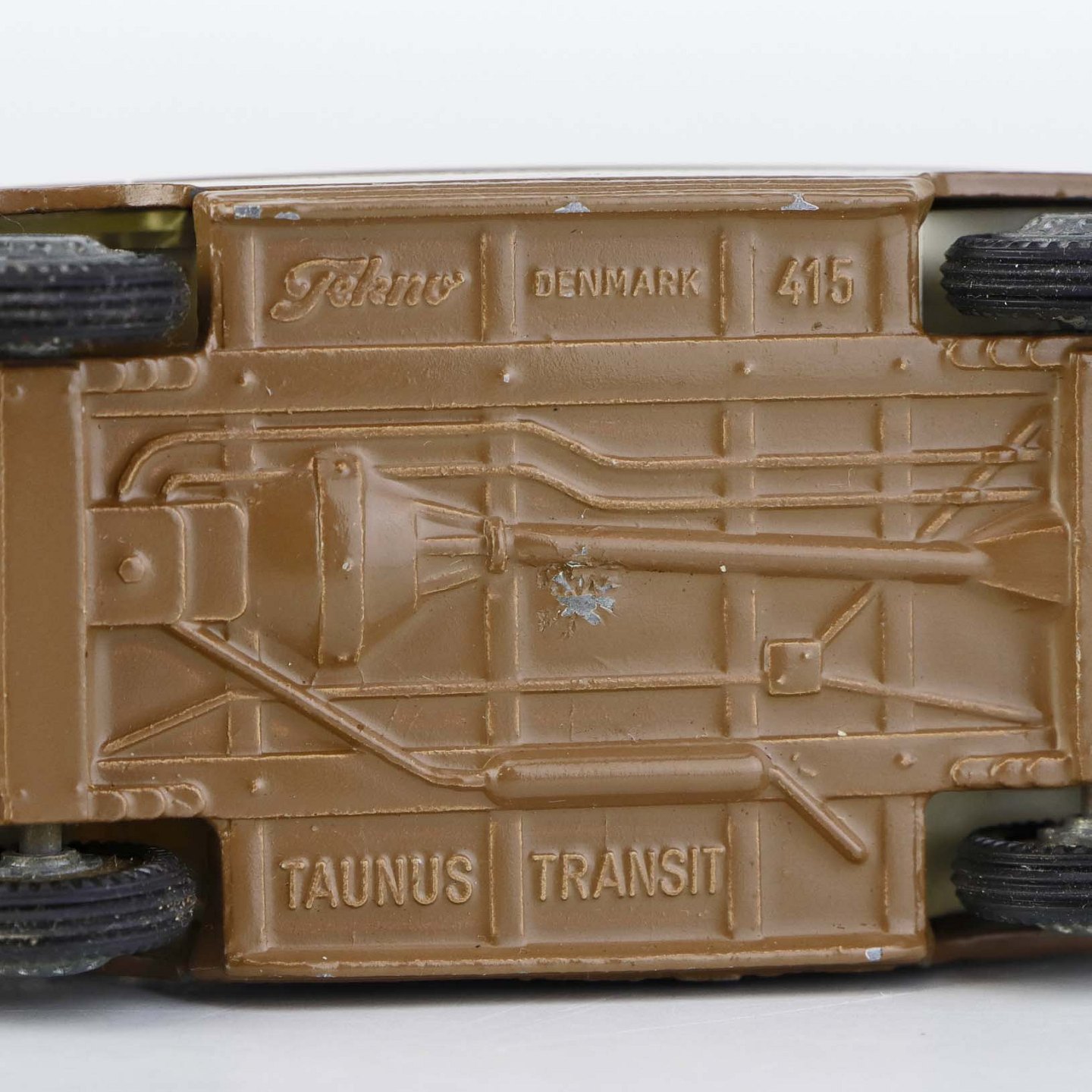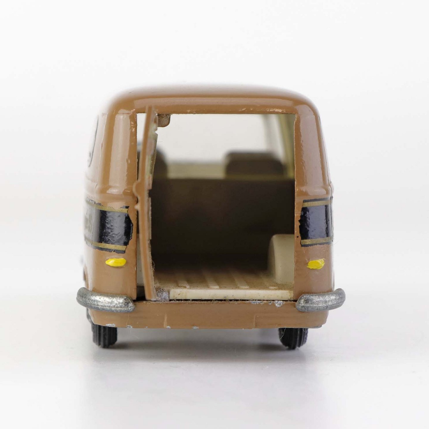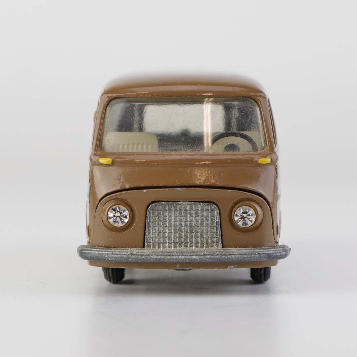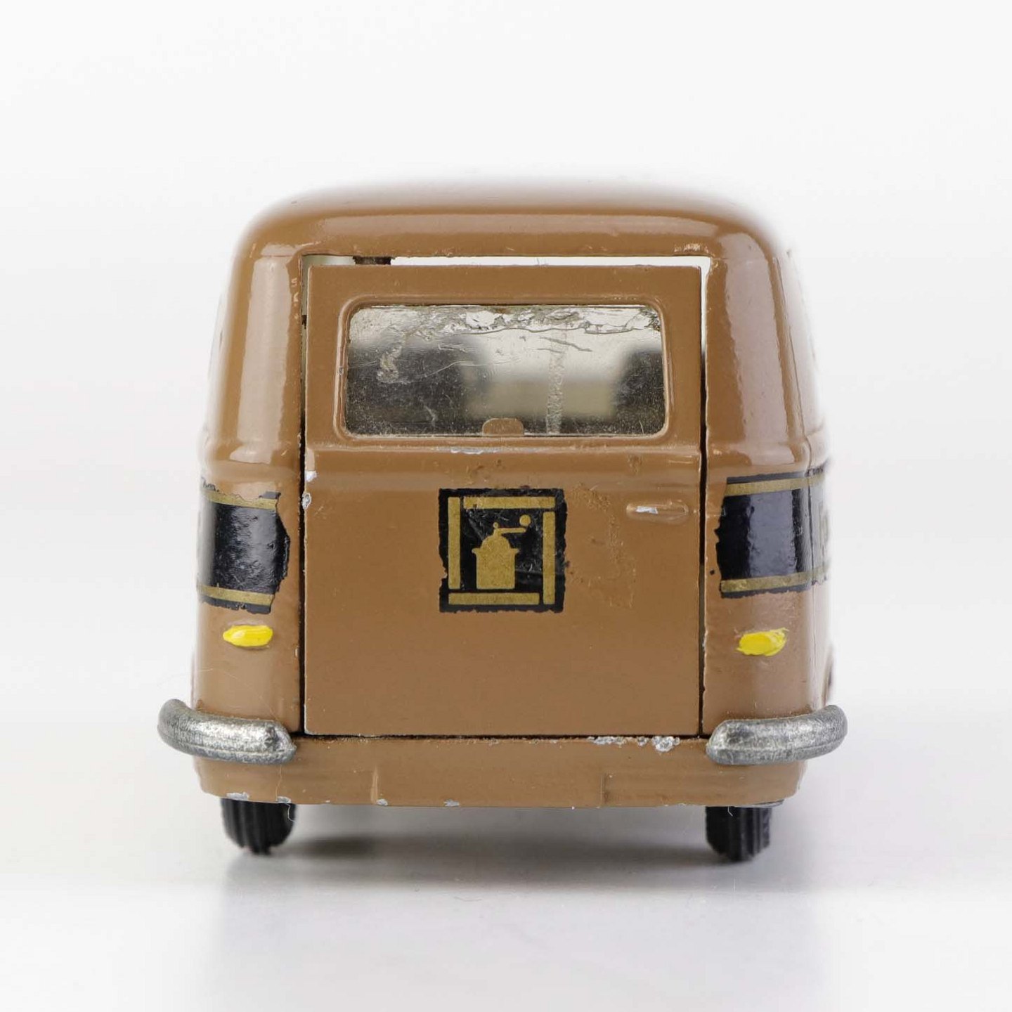 Taunus Transit legetøjsbil i brunlakeret metal med gummi hjul og teksten Ali Kaffe, Forenede kaffekompagnier. Nr. 415