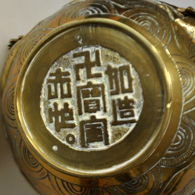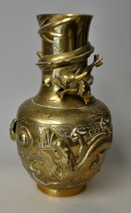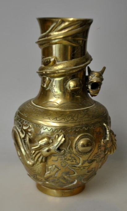 Kinesisk bronze vase, 20. årh. Dekoreret med slygende drager. Korpus rigt dekoreret med planter i relief. Stemplet. Højde.: 24 cm.