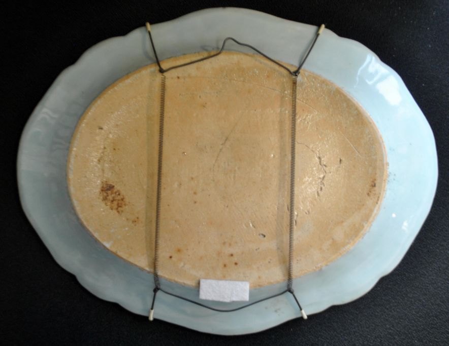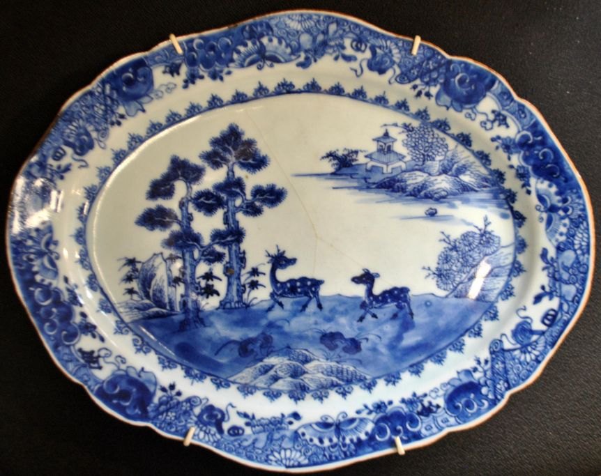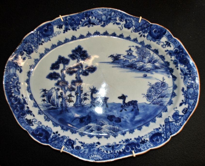 Kinesisk blue and white fad, 18. årh. Med håndmalede dekorationer af hjorte i landskab. I baggrunden pagode. Rand dekoreret med blomster og sommerfugle. L.: 36,5 cm. B.: 28,5 cm.