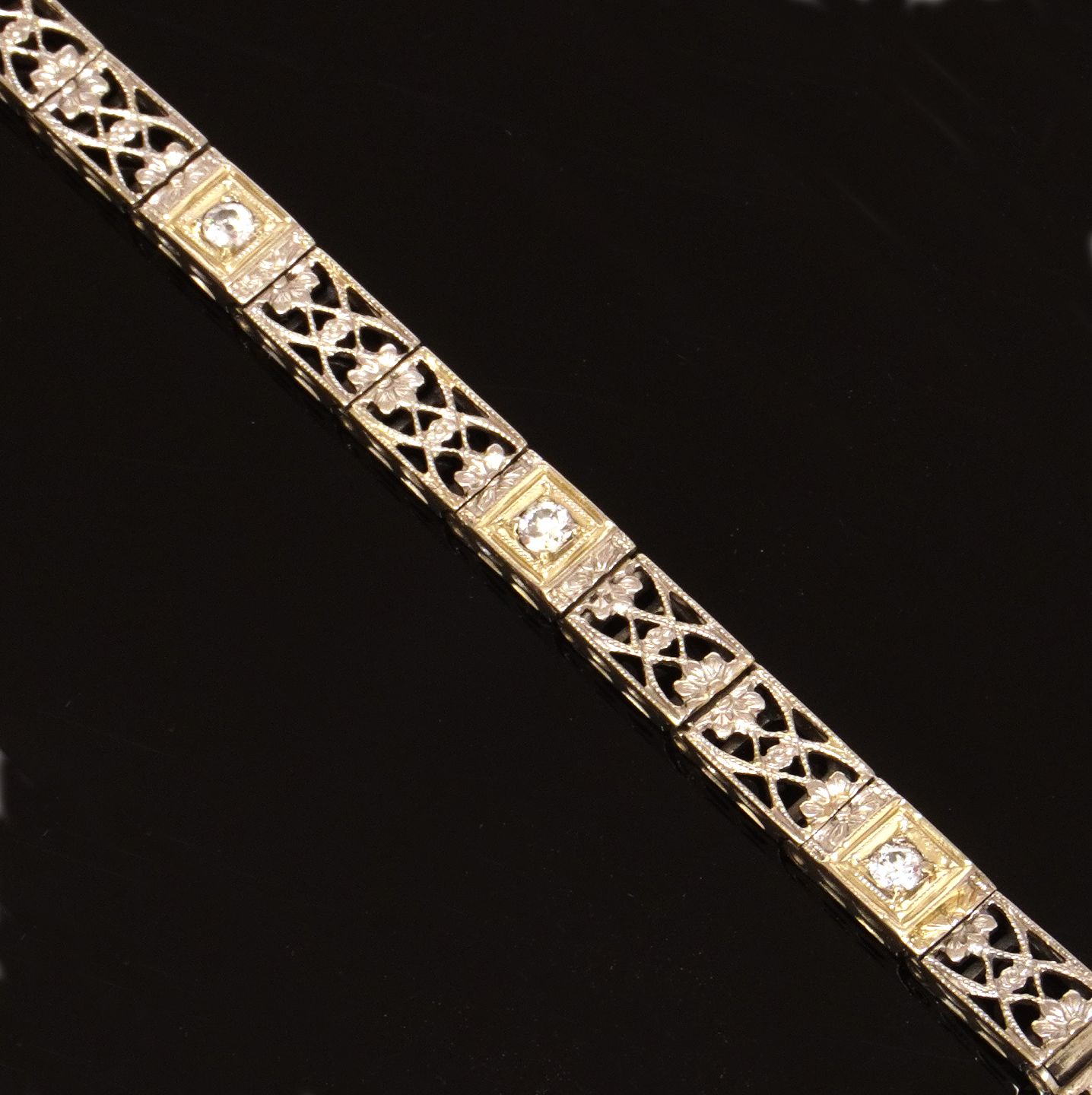 14kt hvidguld leddelt armlænke prydet med gennembrudte dekorationer og tre diamanter ca. 0,25ct i alt. L: 18,5cm. B: 4,5mm |