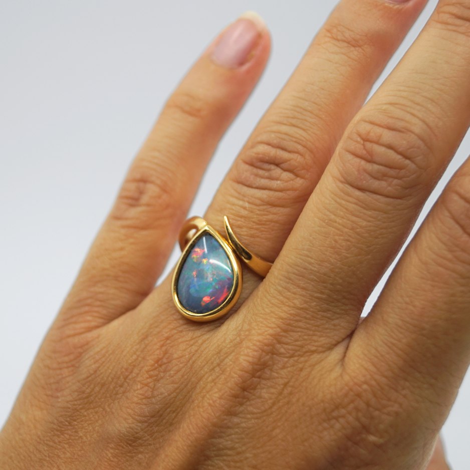 Georg Jensen; Ring i 18 kt. guld prydet med stor dråbeformet opal.