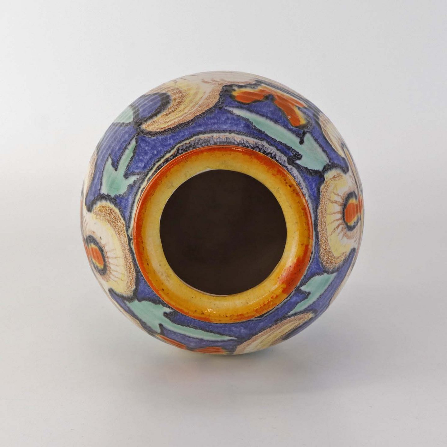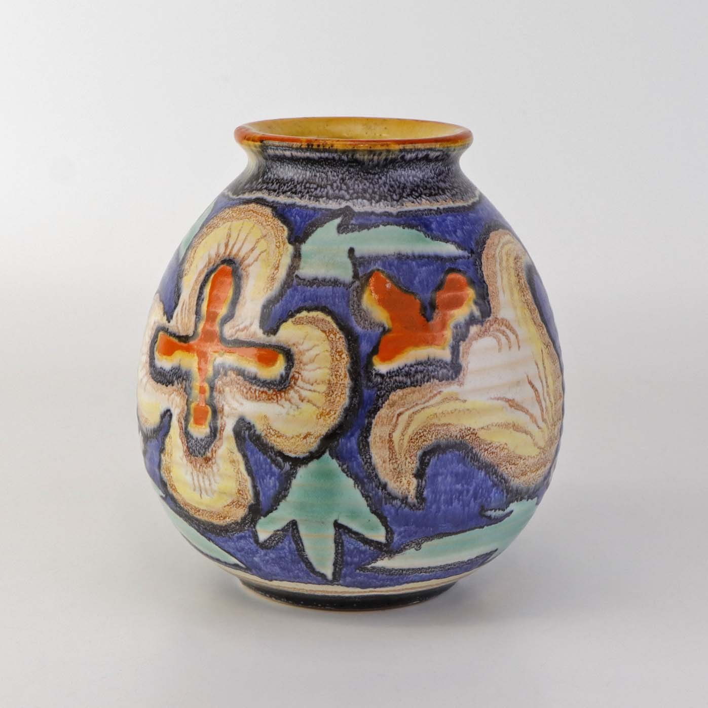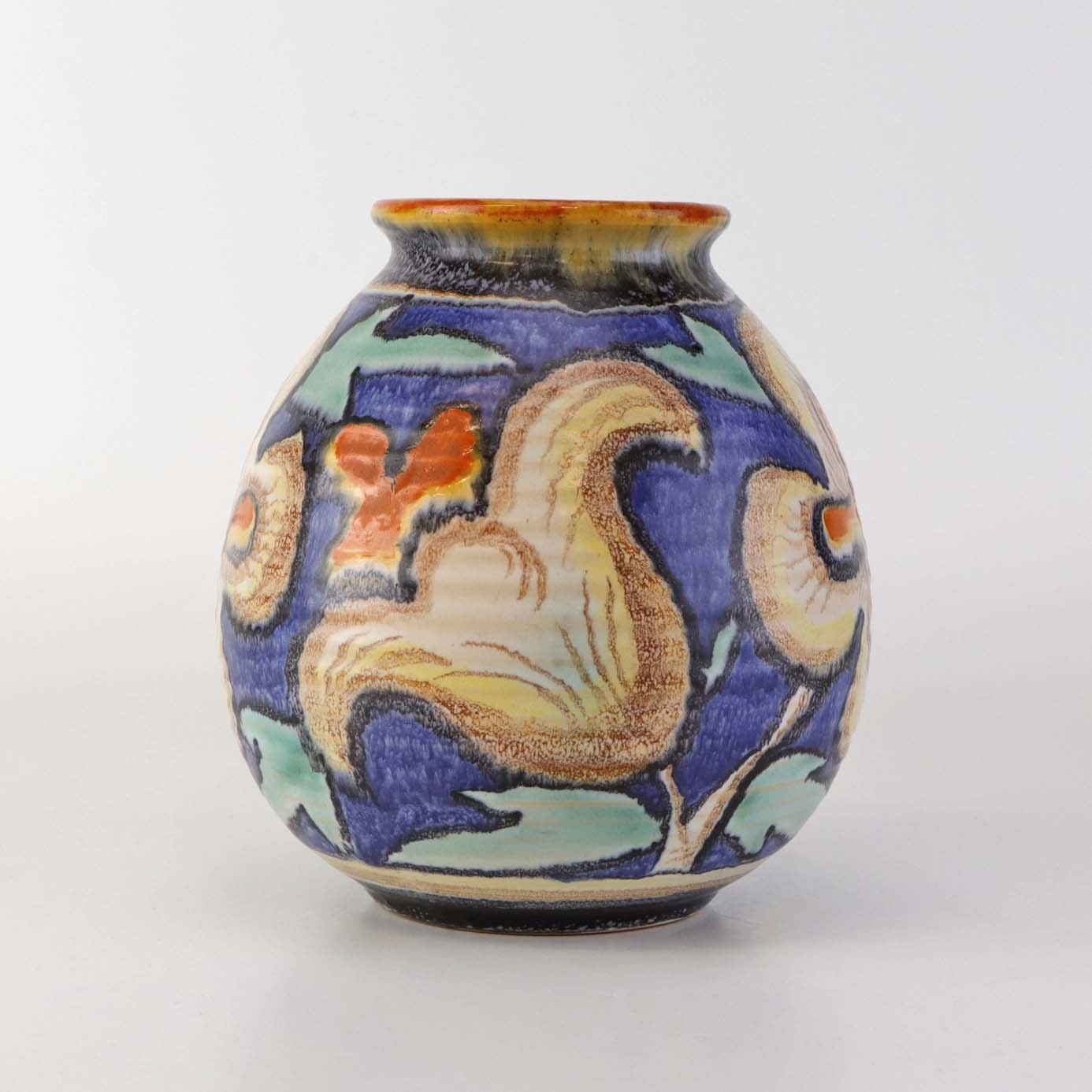 Oval vase i keramik med let riflet struktur og dekoreret med farverig blomstermotiv på blå baggrund.