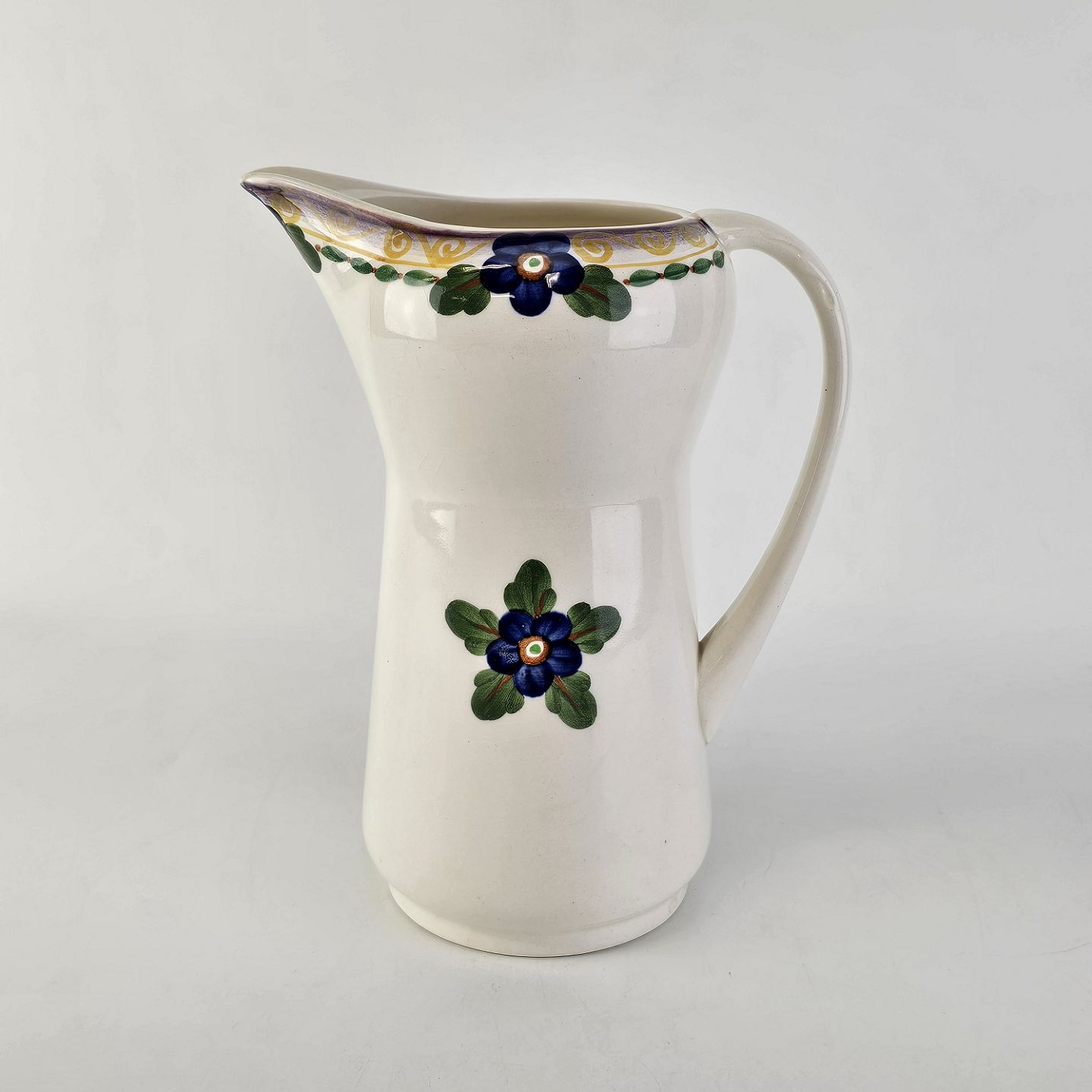 Stellet er i hvid fajance og håndmalet med dekoration af blå violer