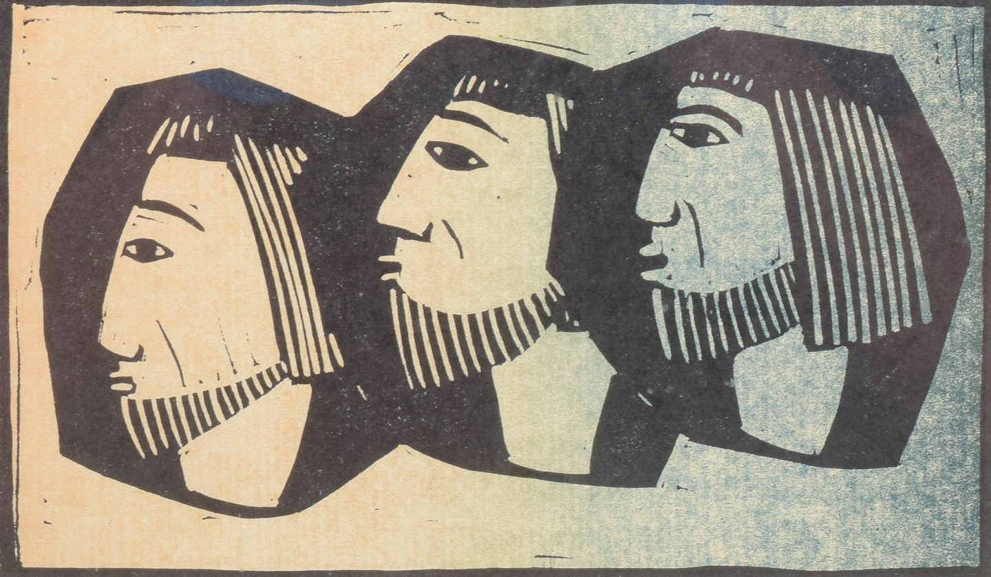 Et karakteristisk grafisk blad af den svenske billedkunstner og keramiker Åke Holm, kendt for sine ekspressive, stiliserede kompositioner med religiøse og figurative motiver.