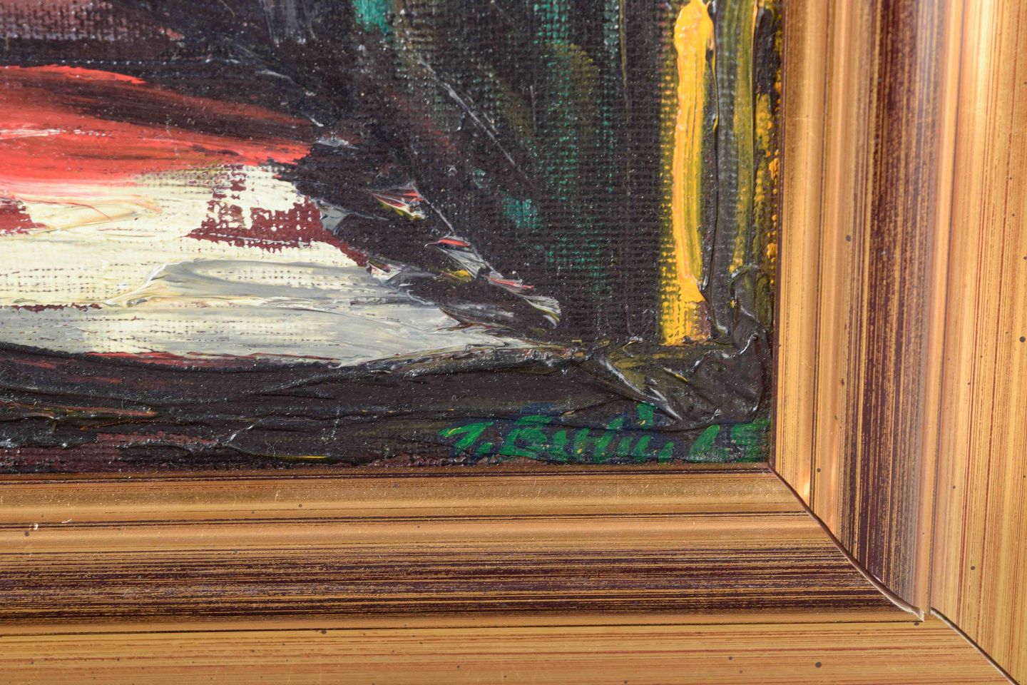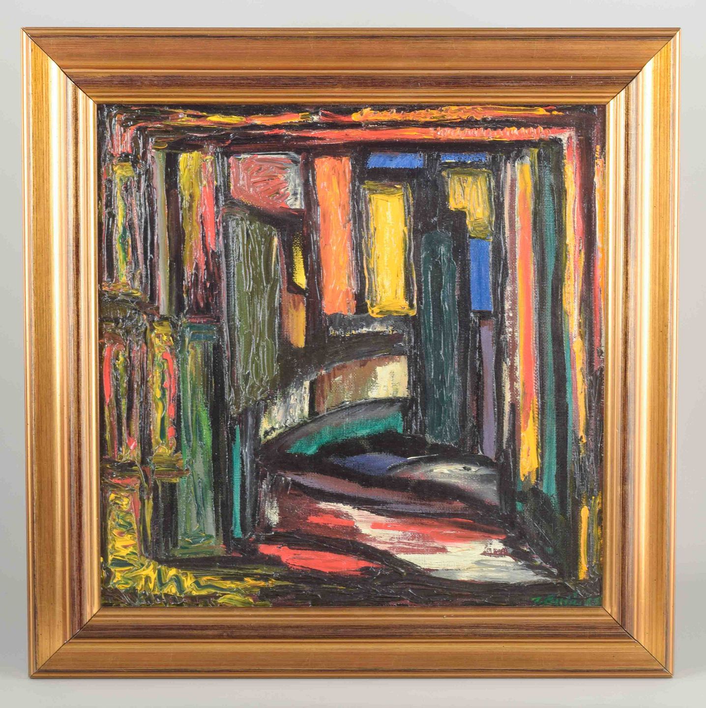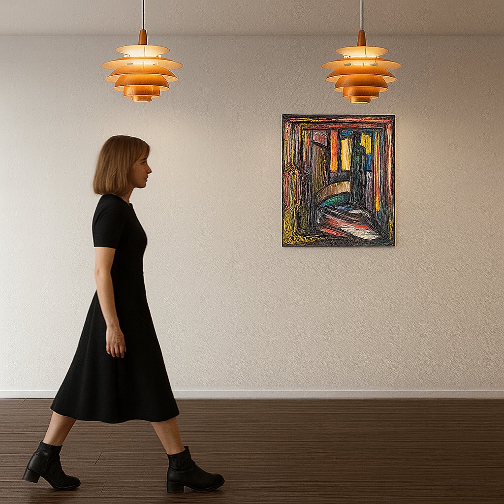 Et ekspressivt maleri af den svenske kunstner Tord Petter Berlin. Værket er udført med kraftige penselstrøg og en intens farvepalet i røde, gule, grønne og blå toner. Kompositionen er præget af geometriske former og arkitektoniske strukturer, der giver maleriet en dynamisk og rytmisk karakter.