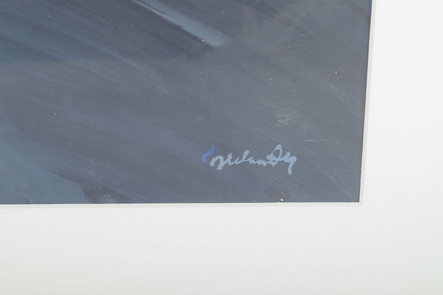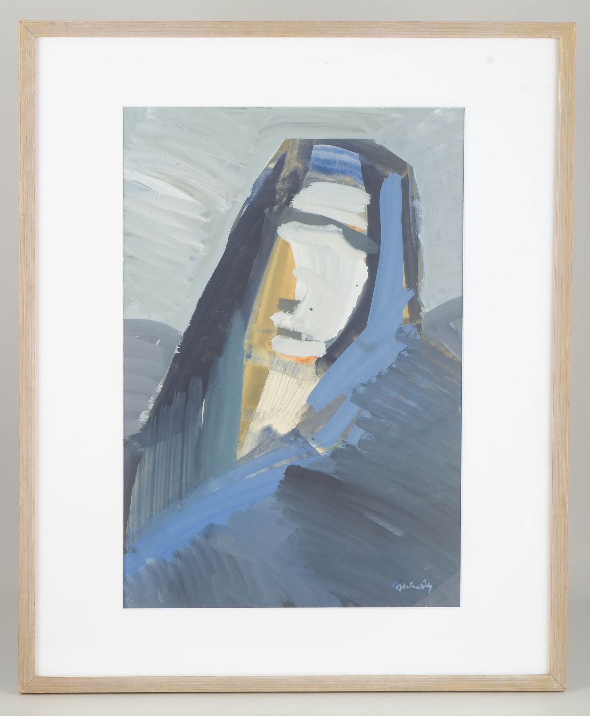 Et tidligt værk af Jerker Helander fra 1966, udført i gouache med brede, ekspressive penselstrøg i blå, grå og hvide toner. Kompositionen fremstår som en abstraheret figur, hvor kontrasten mellem de kølige farver og de varme gyldne felter skaber en intens, nærmest ikonisk tilstedeværelse.