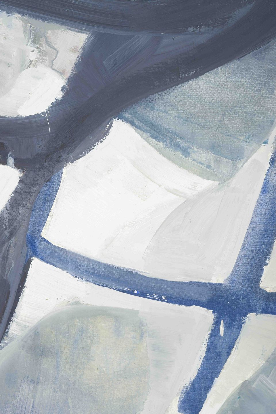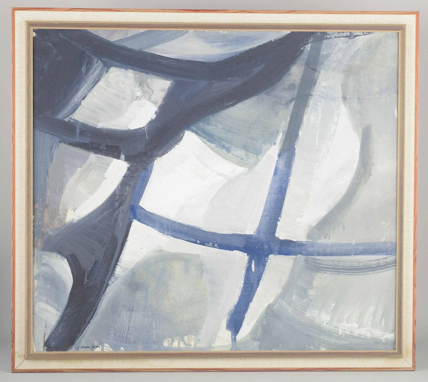 Et abstrakt kompositionsmaleri af svenske kunstner Allan Erwö. Værket er udført i blå, hvide og grå toner med markante penselstrøg, der skaber en rumlig og dynamisk struktur. Titlen “Rummets former” peger på kunstnerens interesse for geometriske spændinger og organiske former i balance.