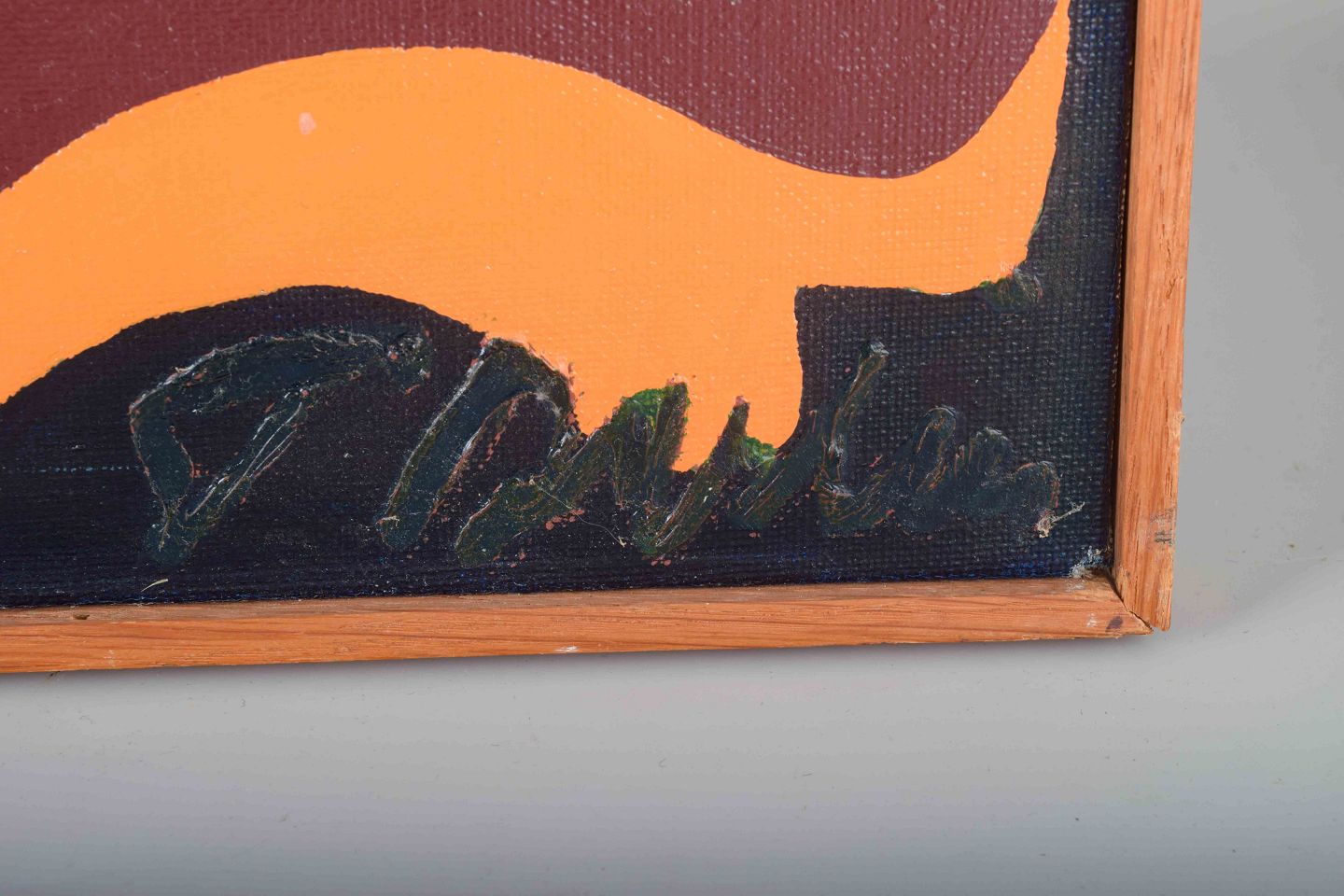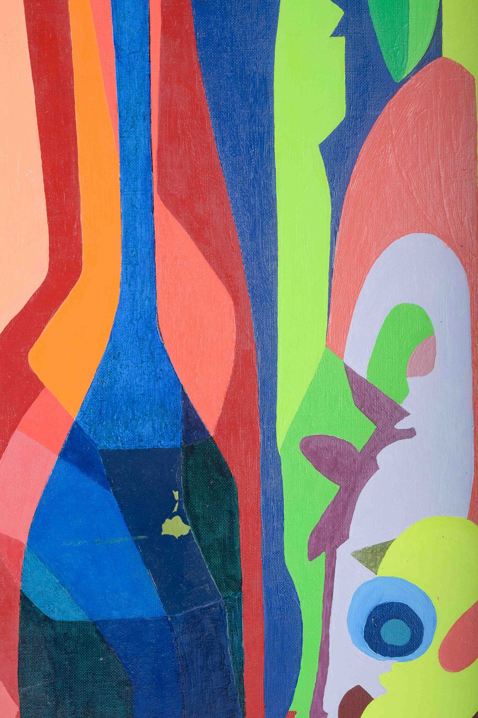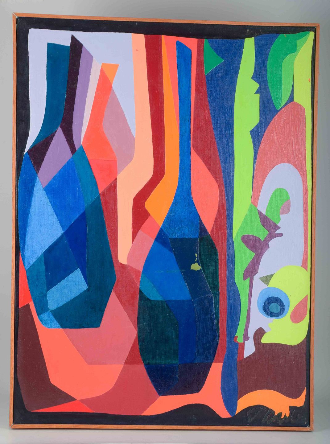 Et farverigt og dekorativt maleri med abstrakte former og stærke kontraster i blå, grønne, røde og rosa toner. Kompositionen er præget af en kubistisk-inspireret stil med overlappende former, hvor motiver af flasker og organiske figurer anes i det geometriske mønster.