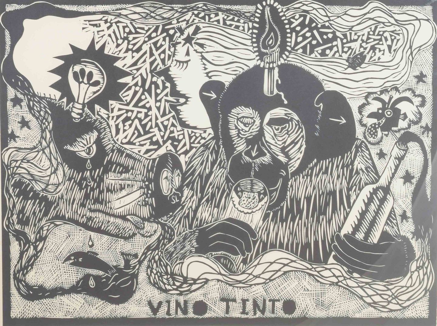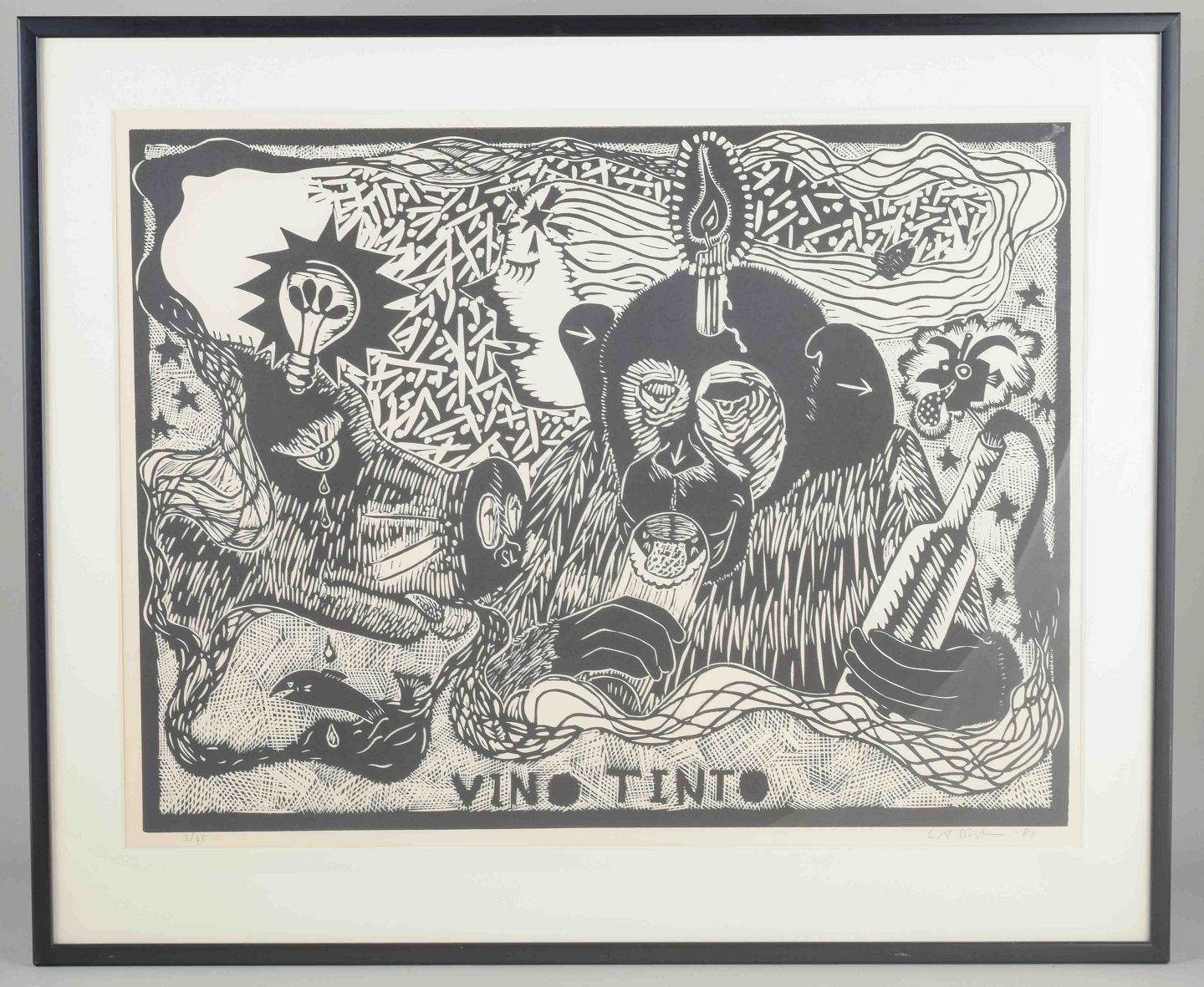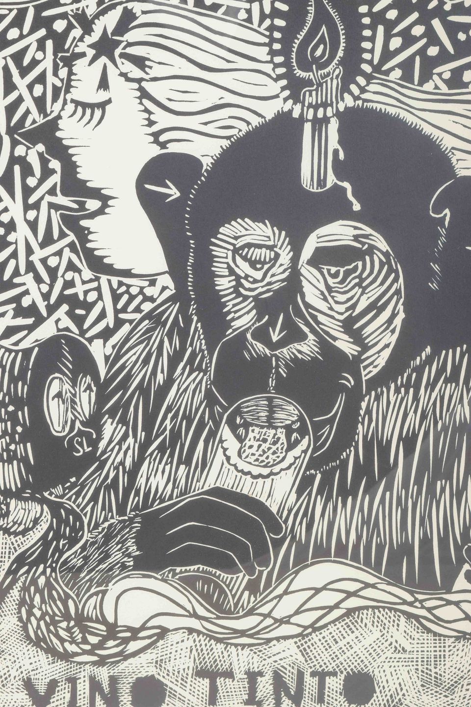 Et ekspressivt og surrealistisk træsnit af den svensk-franske kunstner Erik Dietman, kendt for sin humoristiske og fabulerende billedverden, ofte med absurde og poetiske indslag. Motivet viser aber i en symbolmættet scene, hvor vin spiller en central rolle – et eksempel på Dietmans leg med kunsthistoriske referencer og hverdagslige absurditeter.