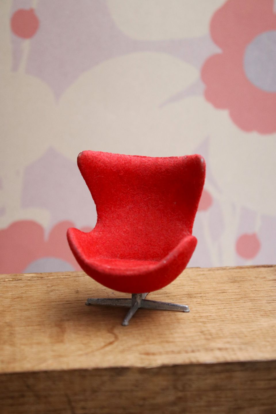 Svane sofa i rød velour , H: 6,6cm. L: 11cm. PRIS: 450 kr.