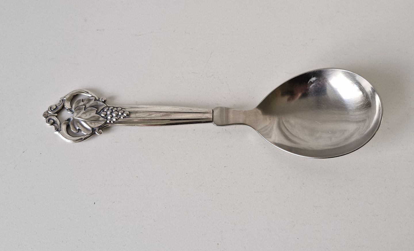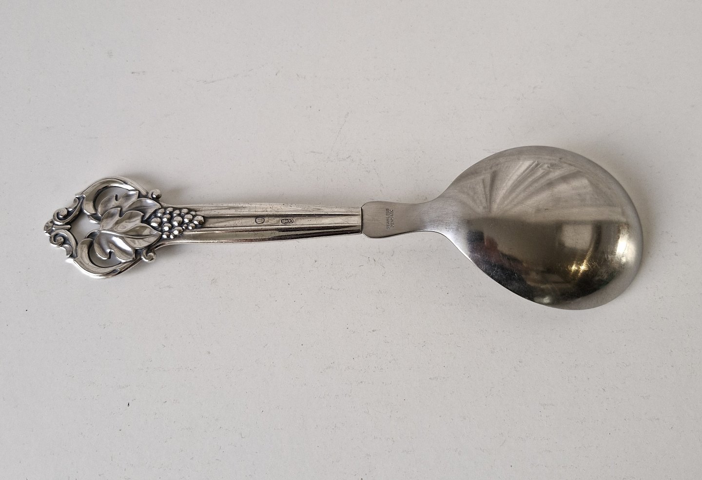 Serveringsske i sølv og stål dekoreret med drueklase